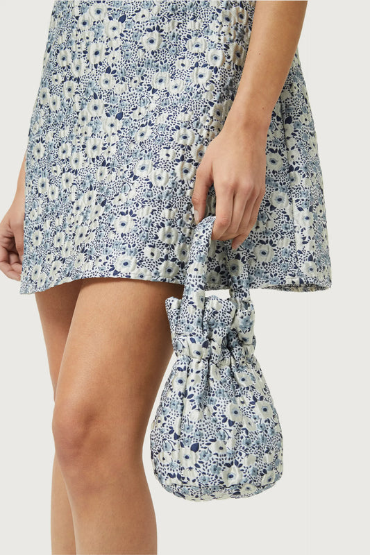 Bolso bombonera con estampado floral azul y blanco