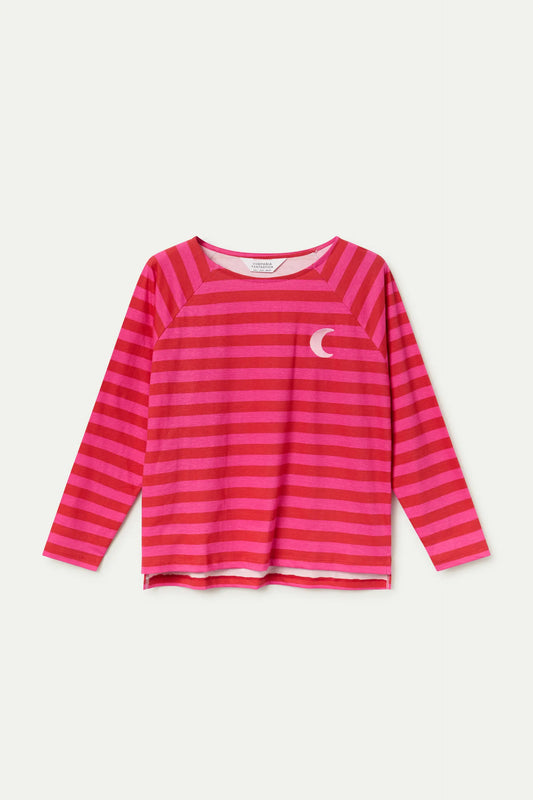 Camiseta 100% algodón con estampado de rayas rosa y bordado de luna