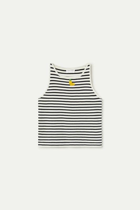 Top de rayas blanco y negro con bordado de banana