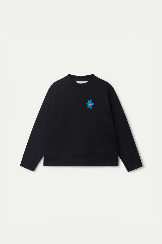 Black sweatshirt with contrasting flower graphic print.