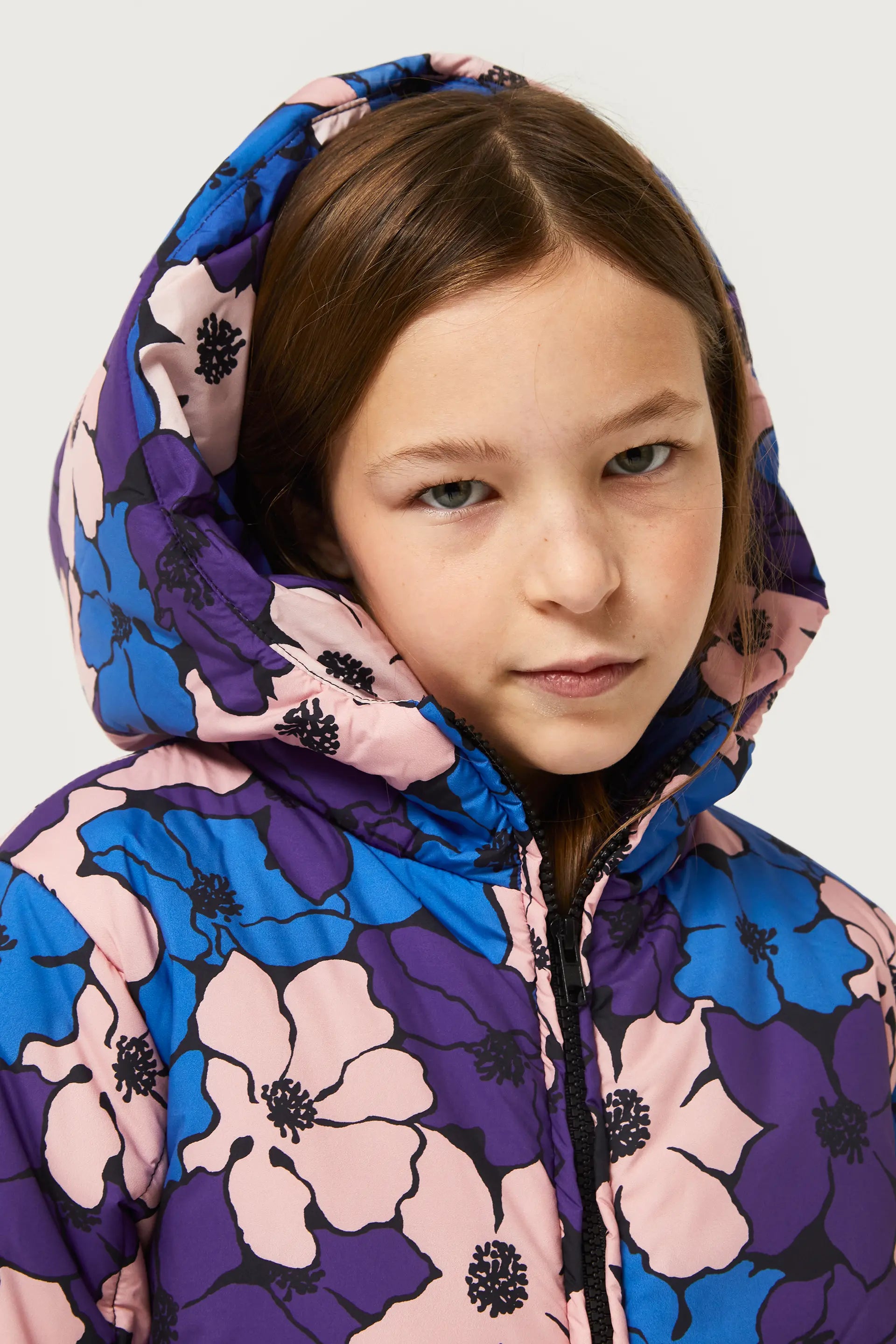 Abrigo acolchado de niñacon estampado de flores azules. Con capucha y manga larga. Cierre frontal de cremallera y bolsillos laterales. Forro interior.