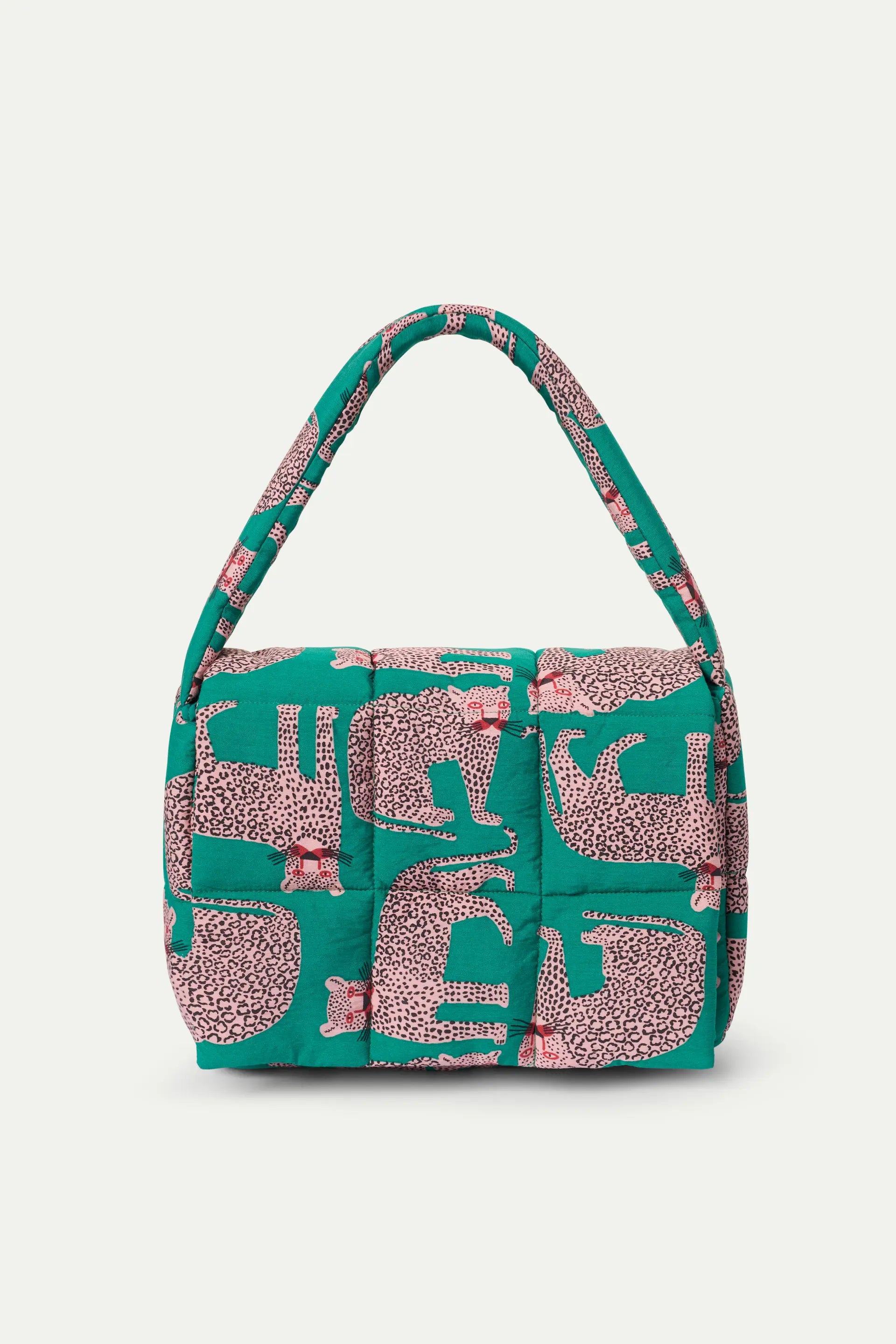 Lightweight crepe handbag with Onca print. Short handle. Magnetic closure. Lined interior. One size fits most.