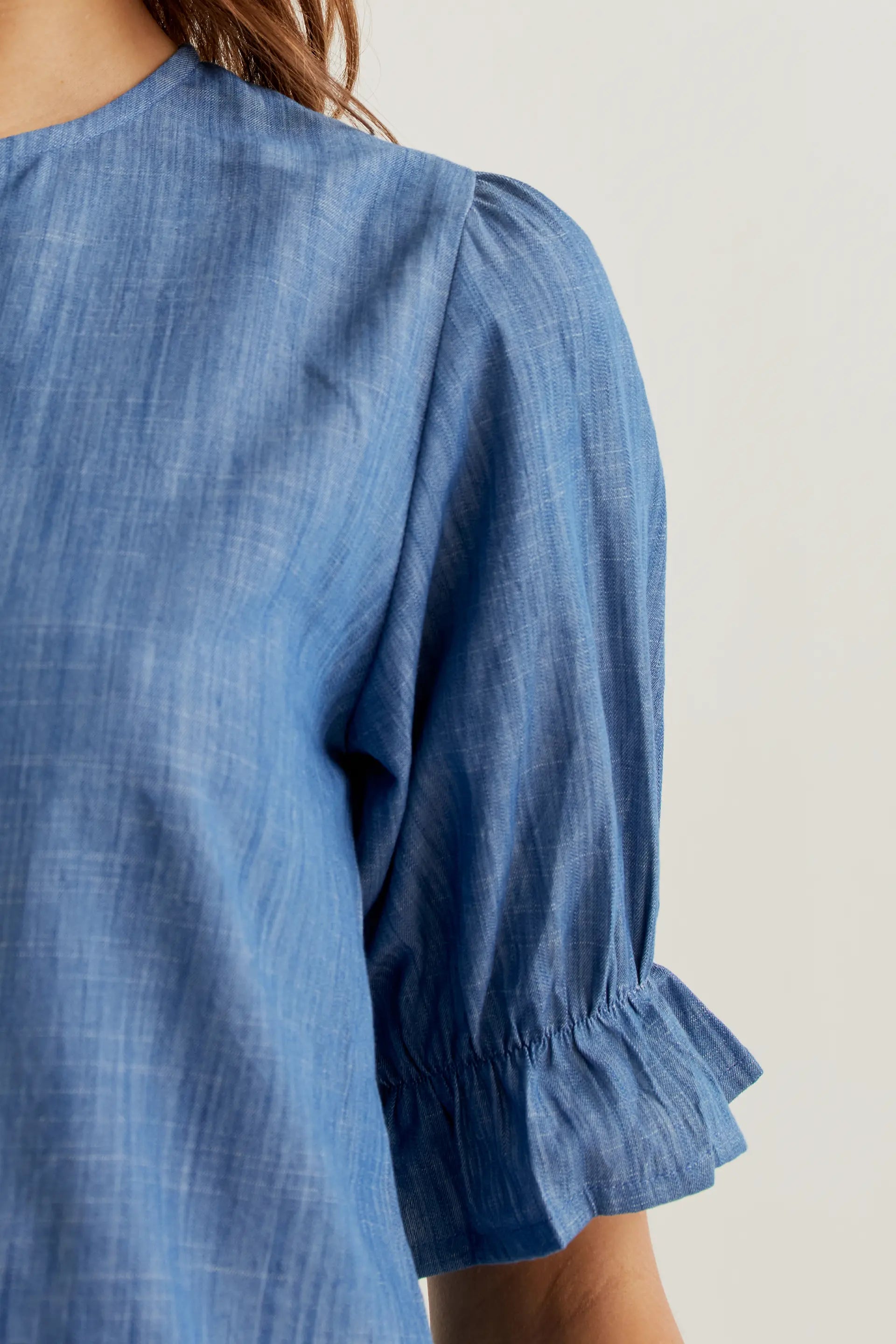 Shirt made from 100% cotton chambray in light blue. Round neck and slightly puffed 3/4 sleeves finished with an elasticated cuff and ruffle. Front button closure with white buttons. Ruffle detail. The model is 177 cm tall and wears size S.
