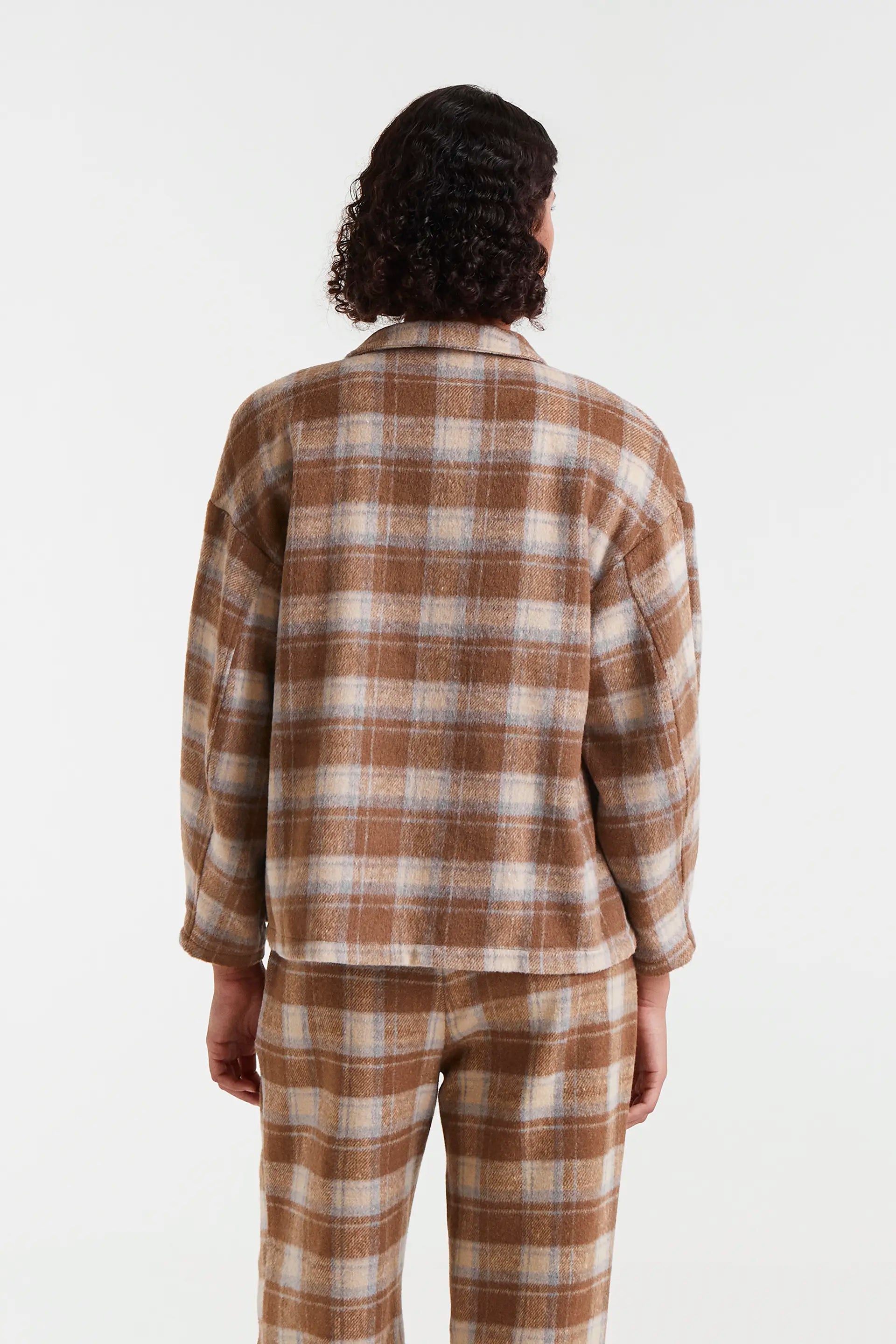 Beige checkered print shirt. Lapel collar and sleeves. Button-front closure. Slightly dropped shoulders. The model is 175 cm tall and is wearing a size S.