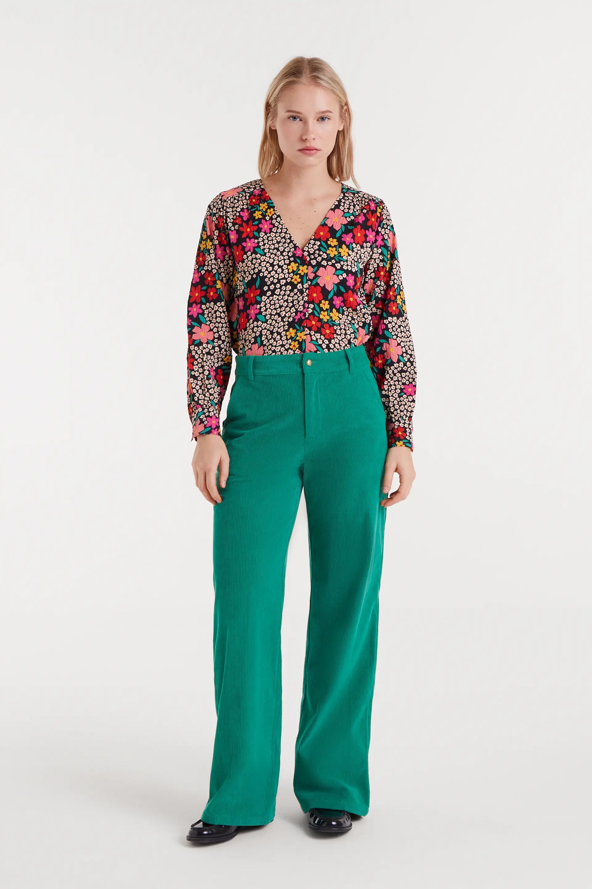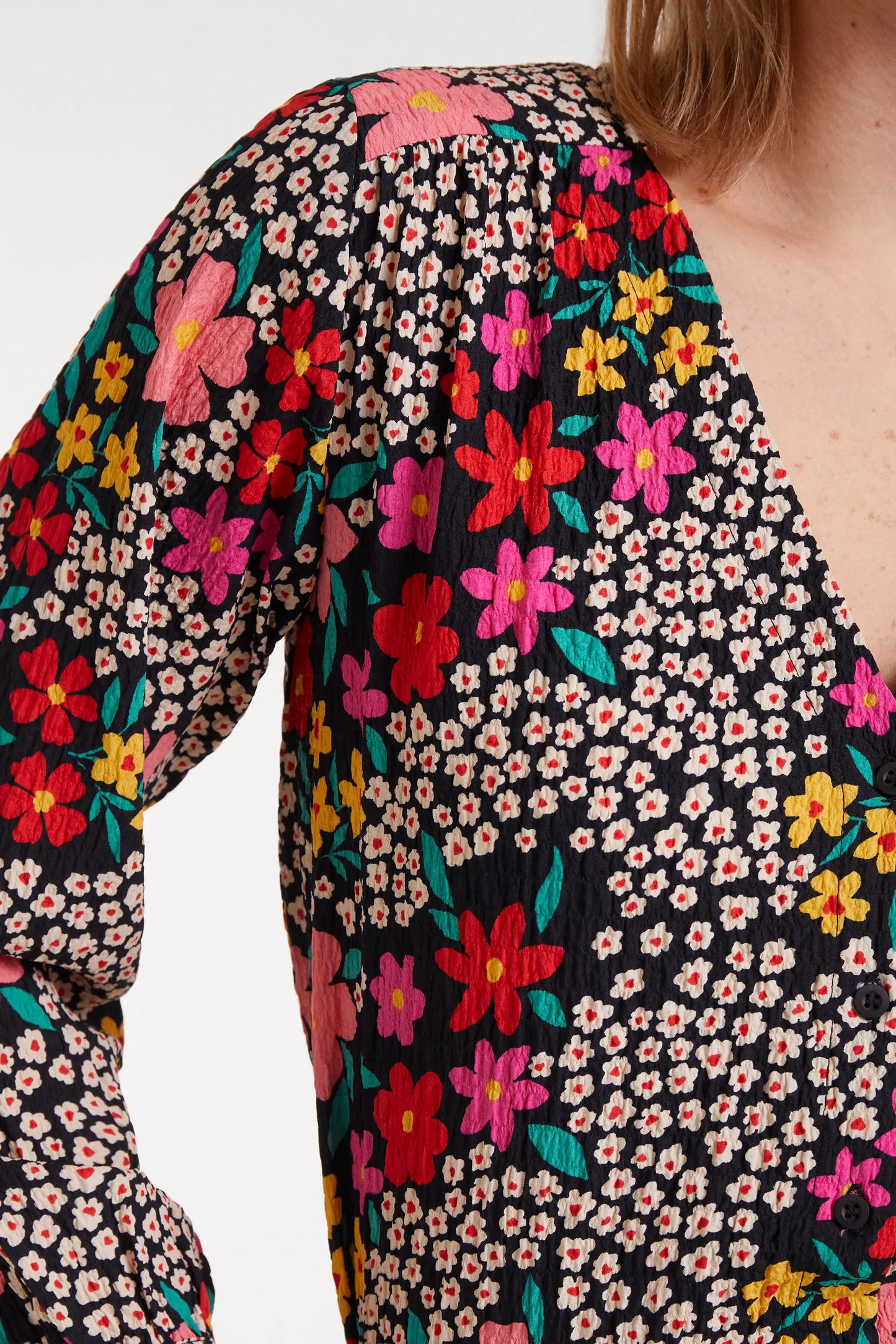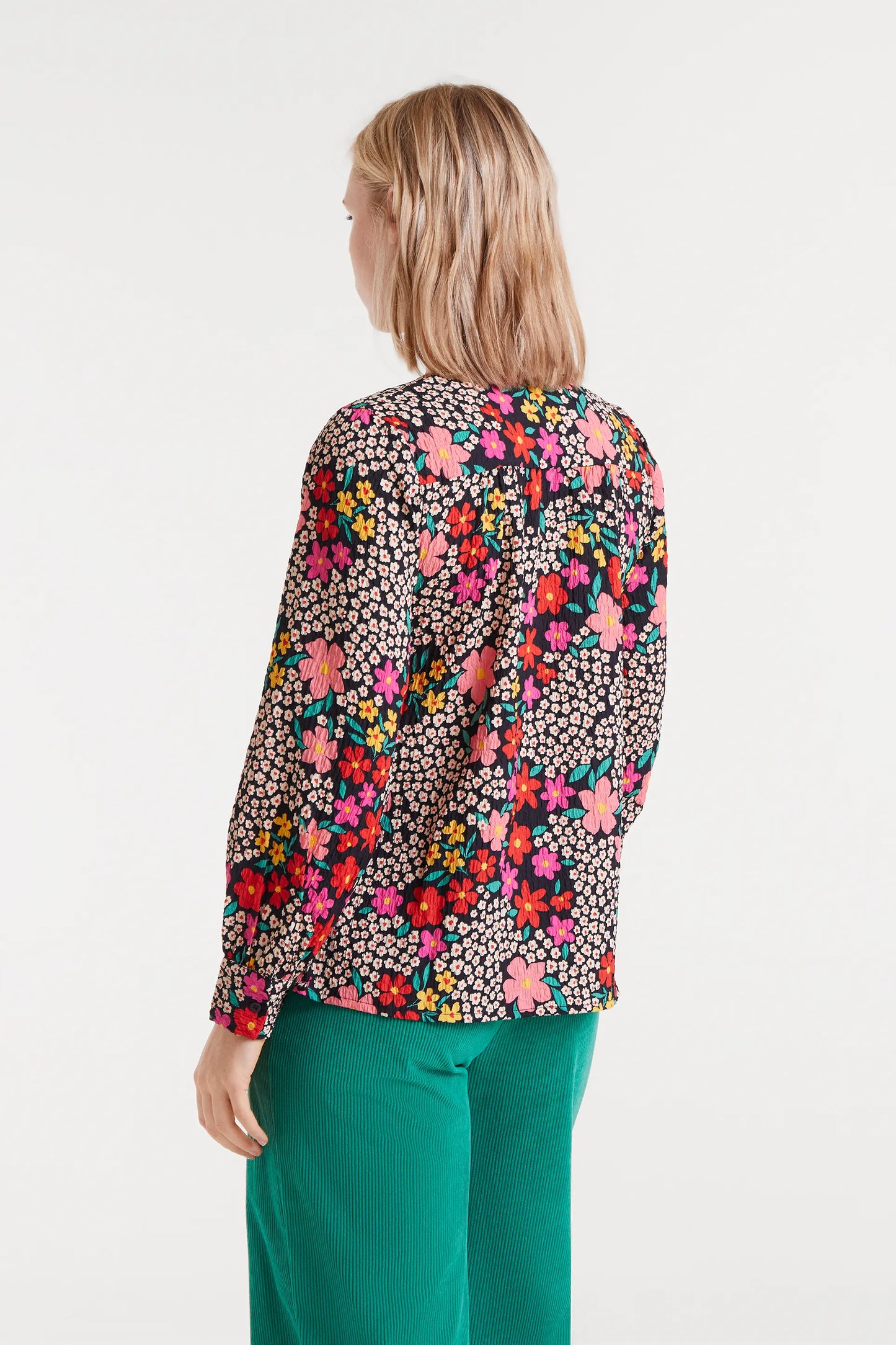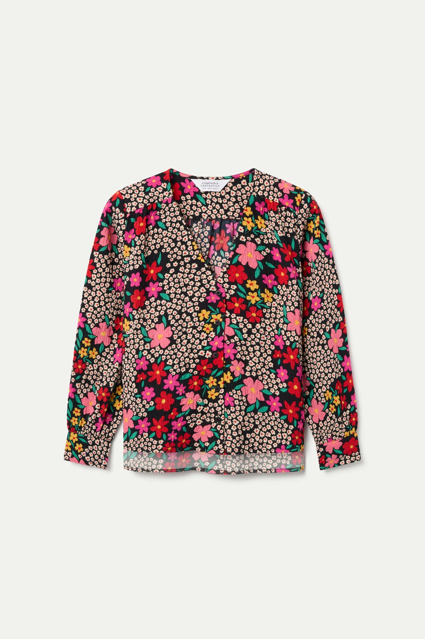Shirt with Giardino print fabric. V-neckline and long sleeves with buttoned cuffs. Front button closure. The model is 179 cm tall and is wearing a size S.