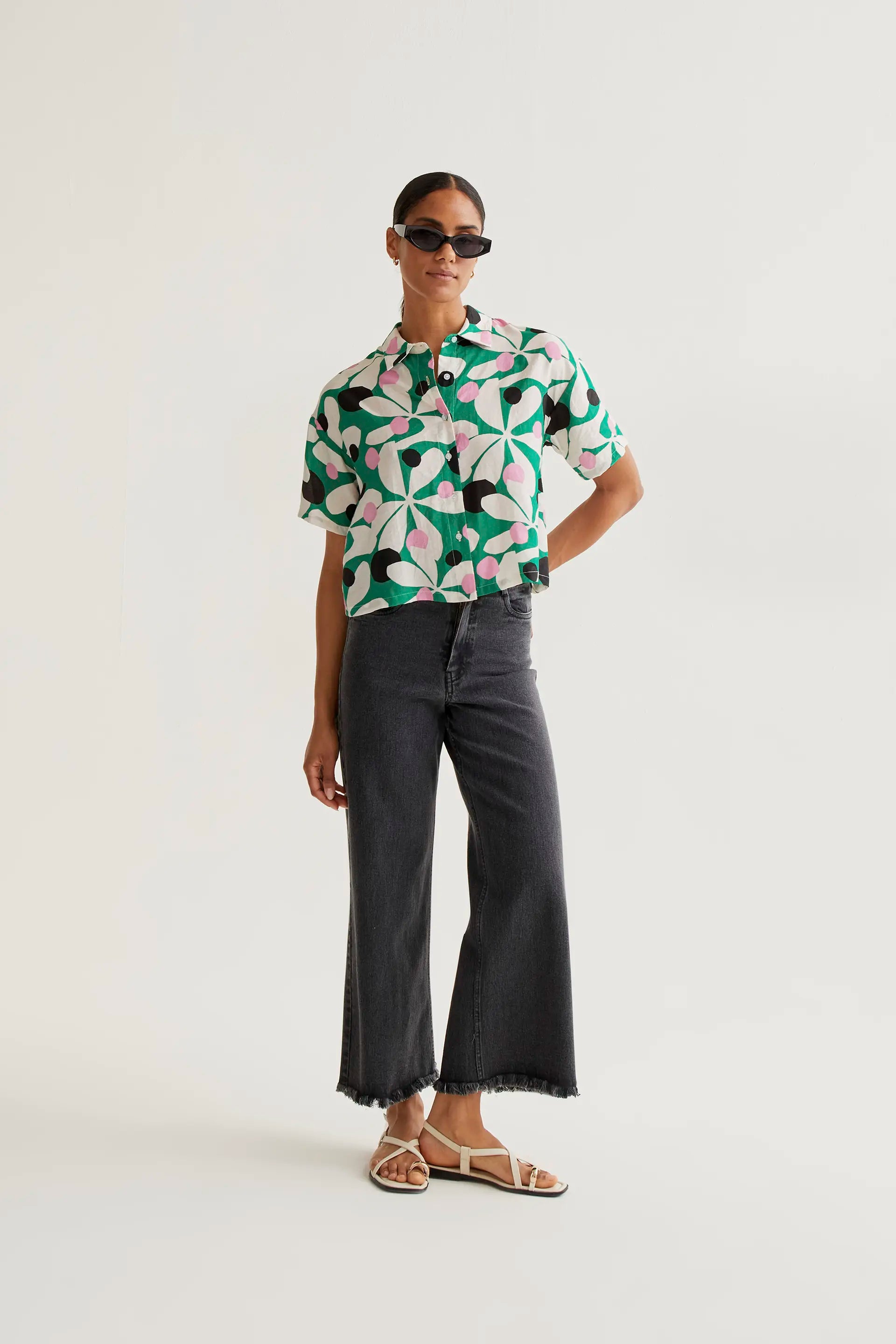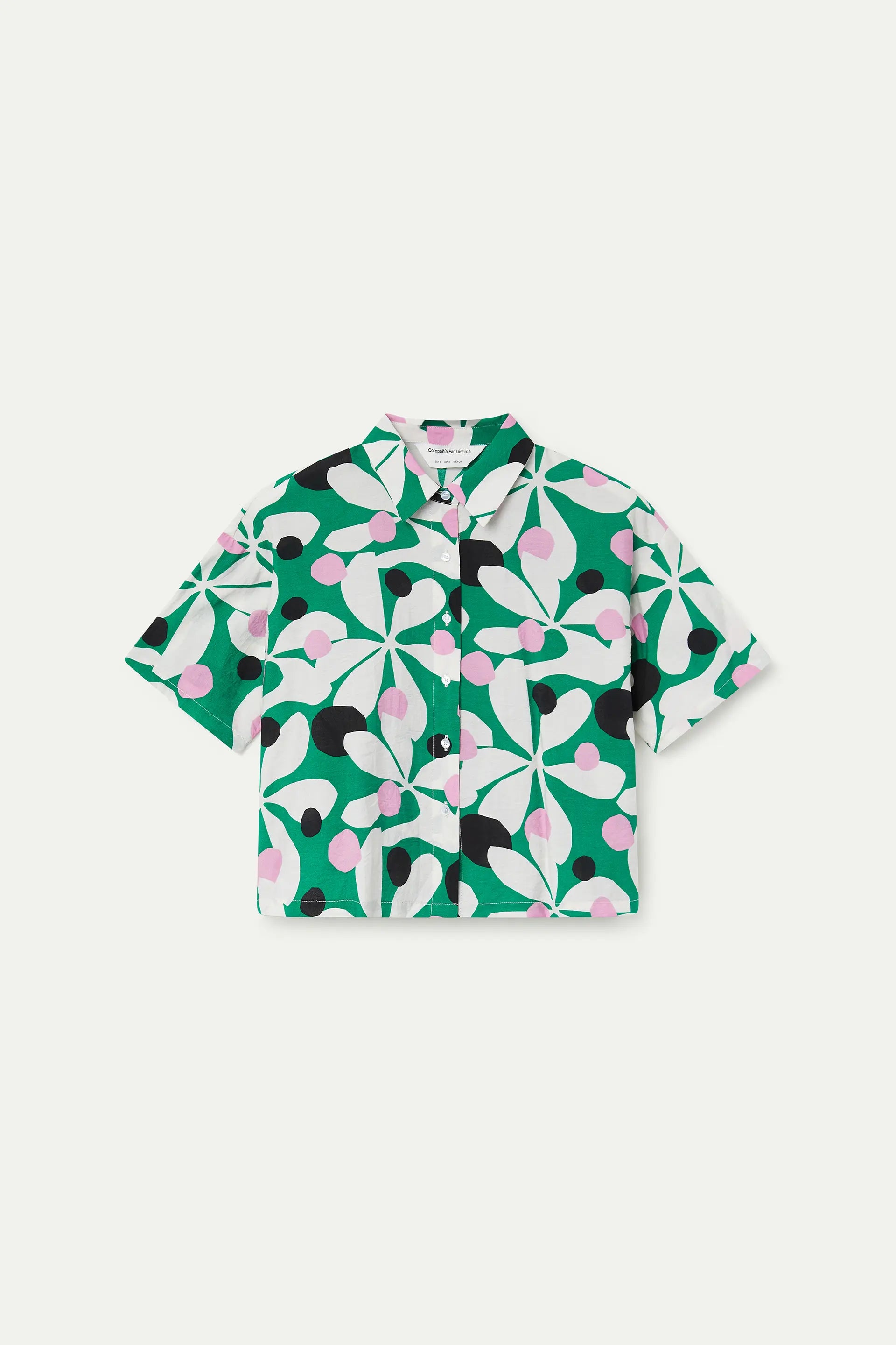 Lightweight crepe shirt with a hosta print. Lapel collar and short sleeves. Slightly dropped shoulders. Front button closure with white buttons. The model is 173 cm tall and wears size S.
