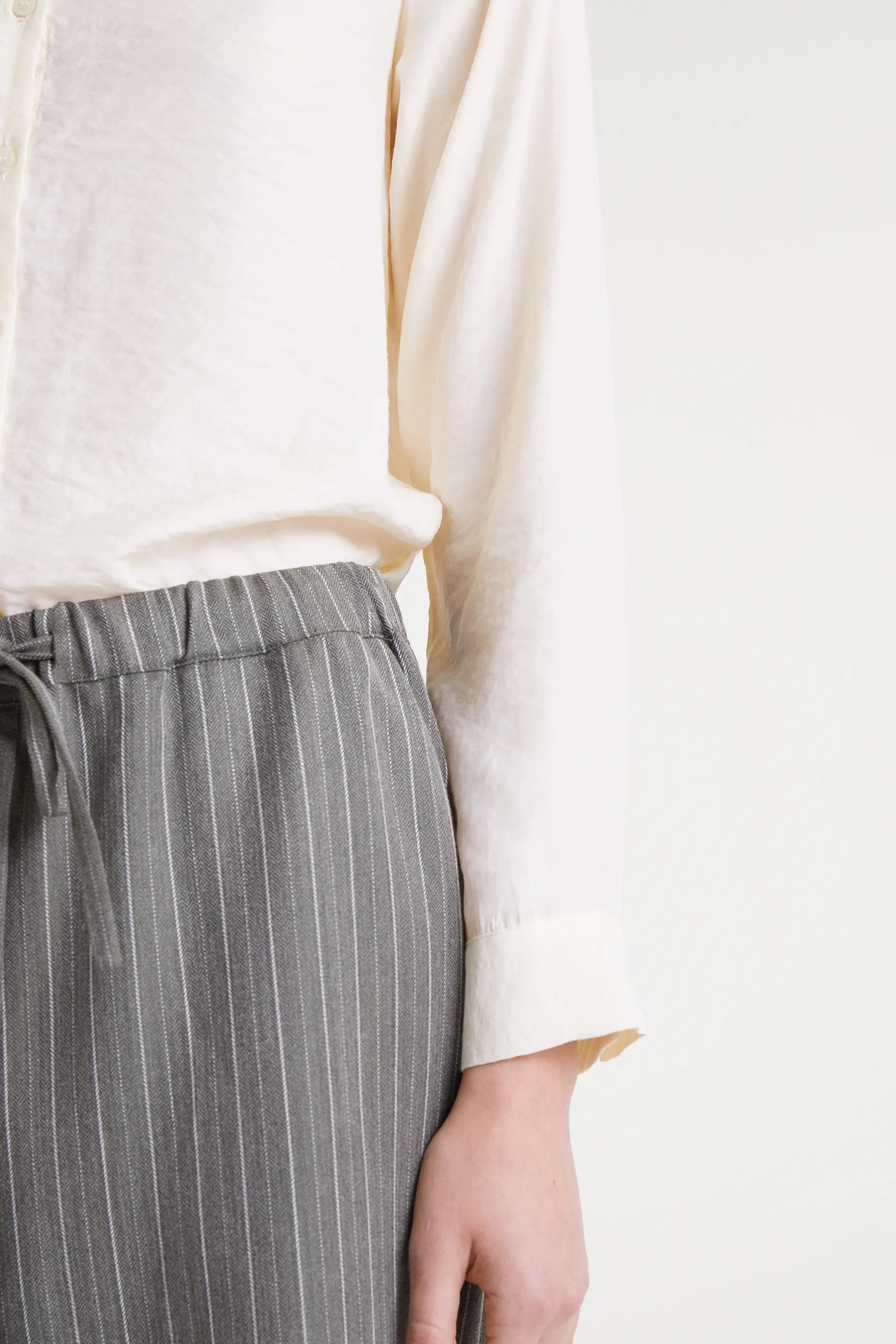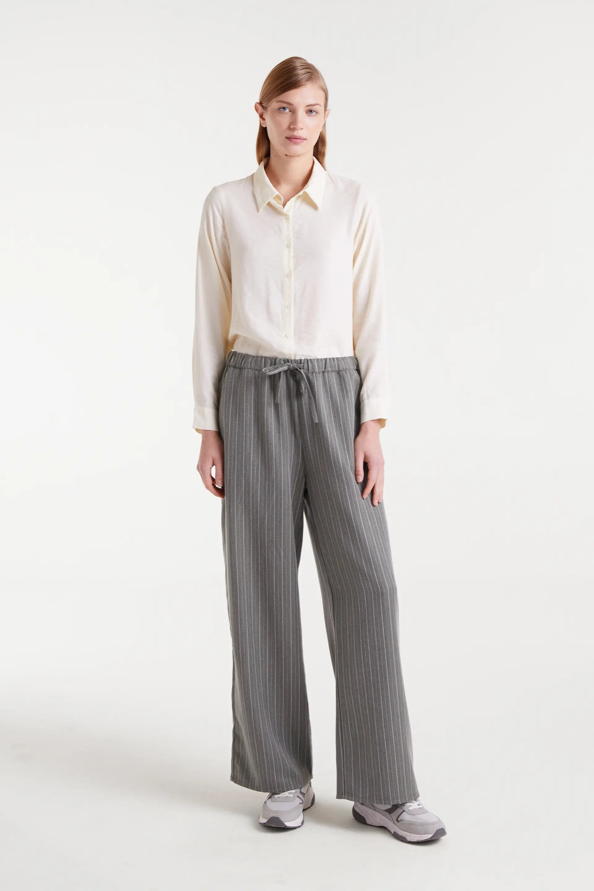 Flowy shirt made from white bamboo viscose fabric. Lapel collar and long sleeves with buttoned cuffs. Front button closure. The model is 179 cm tall and is wearing a size S.