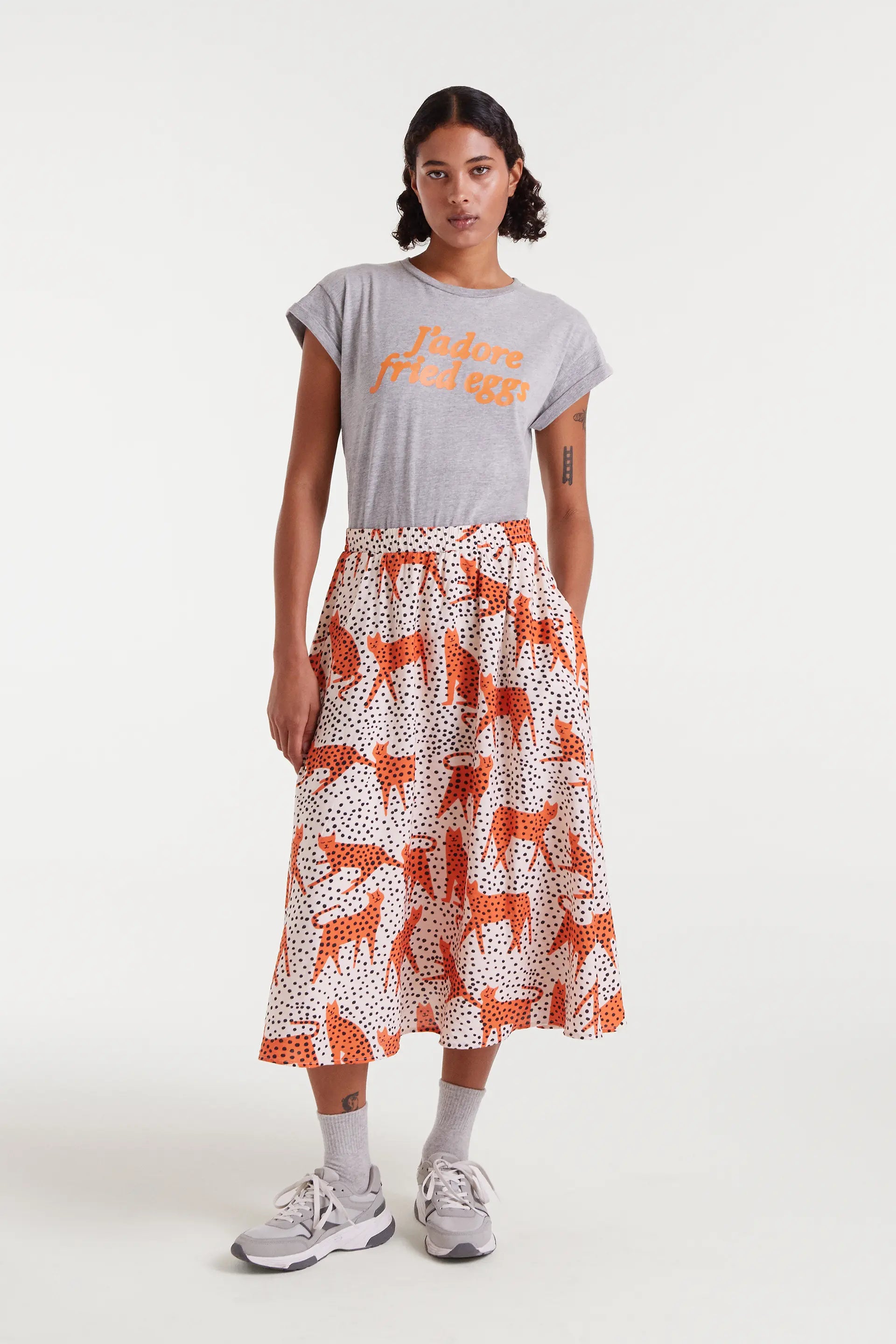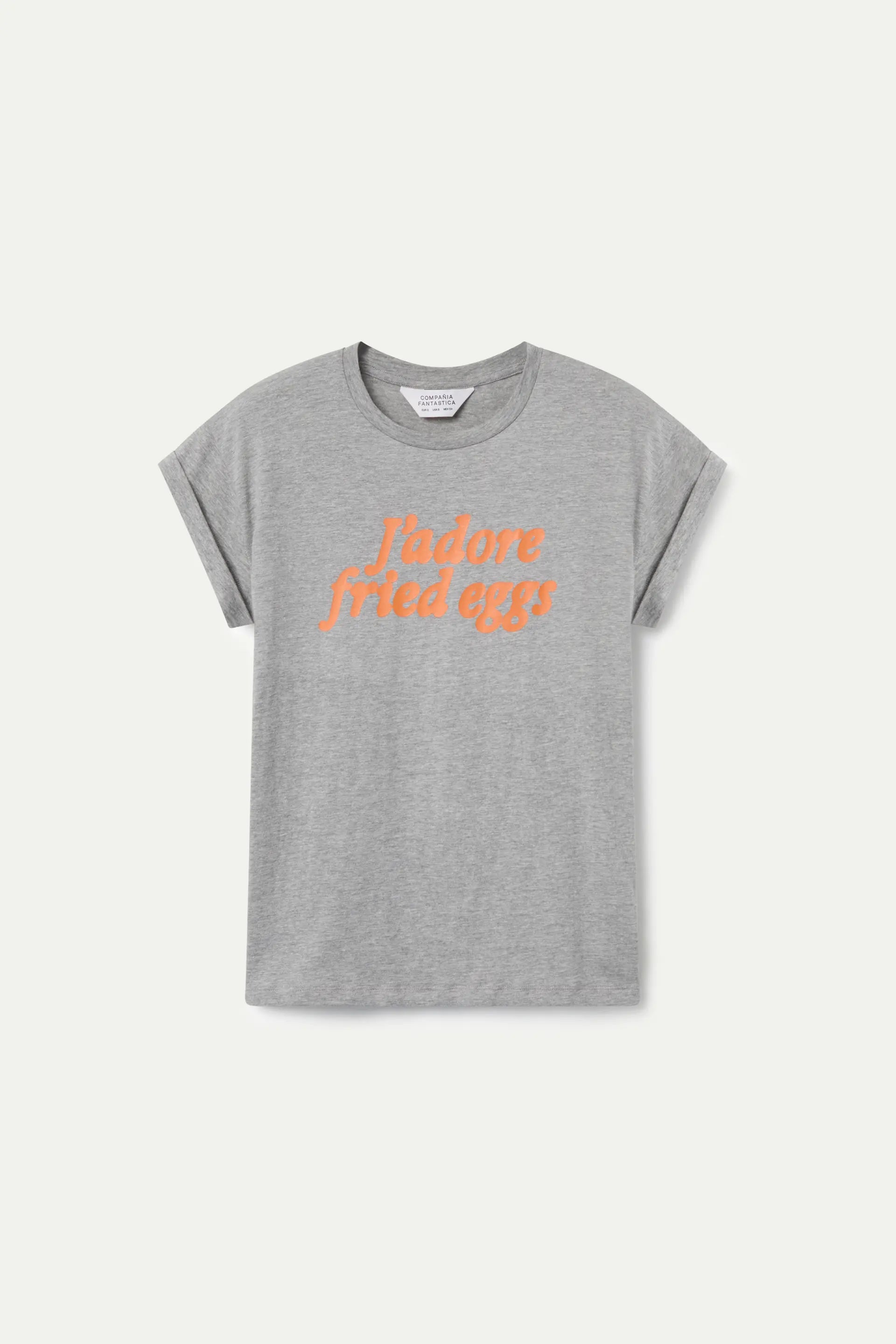 100% cotton T-shirt with J'adore fried eggs print. Crew neck and short, cuffed sleeves. The model is 178 cm tall and is wearing a size S.