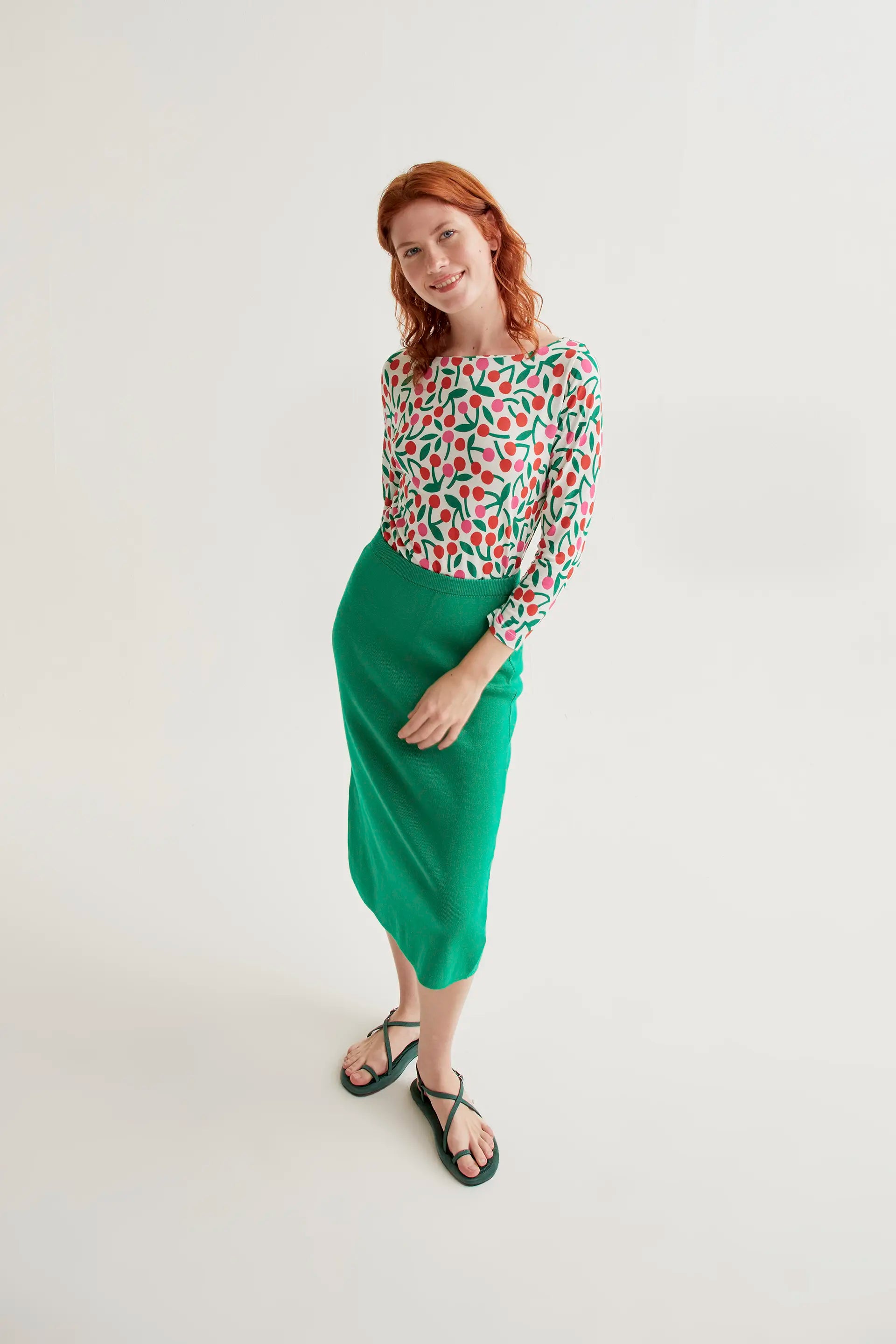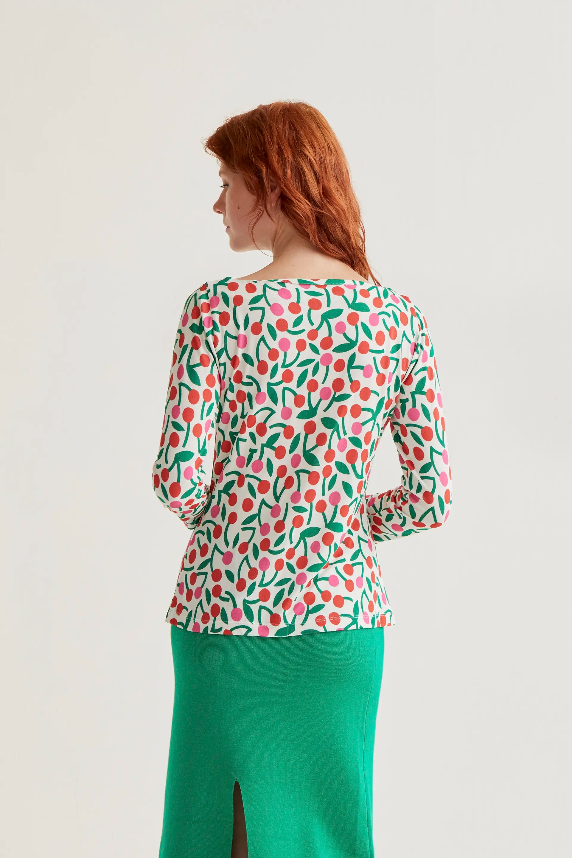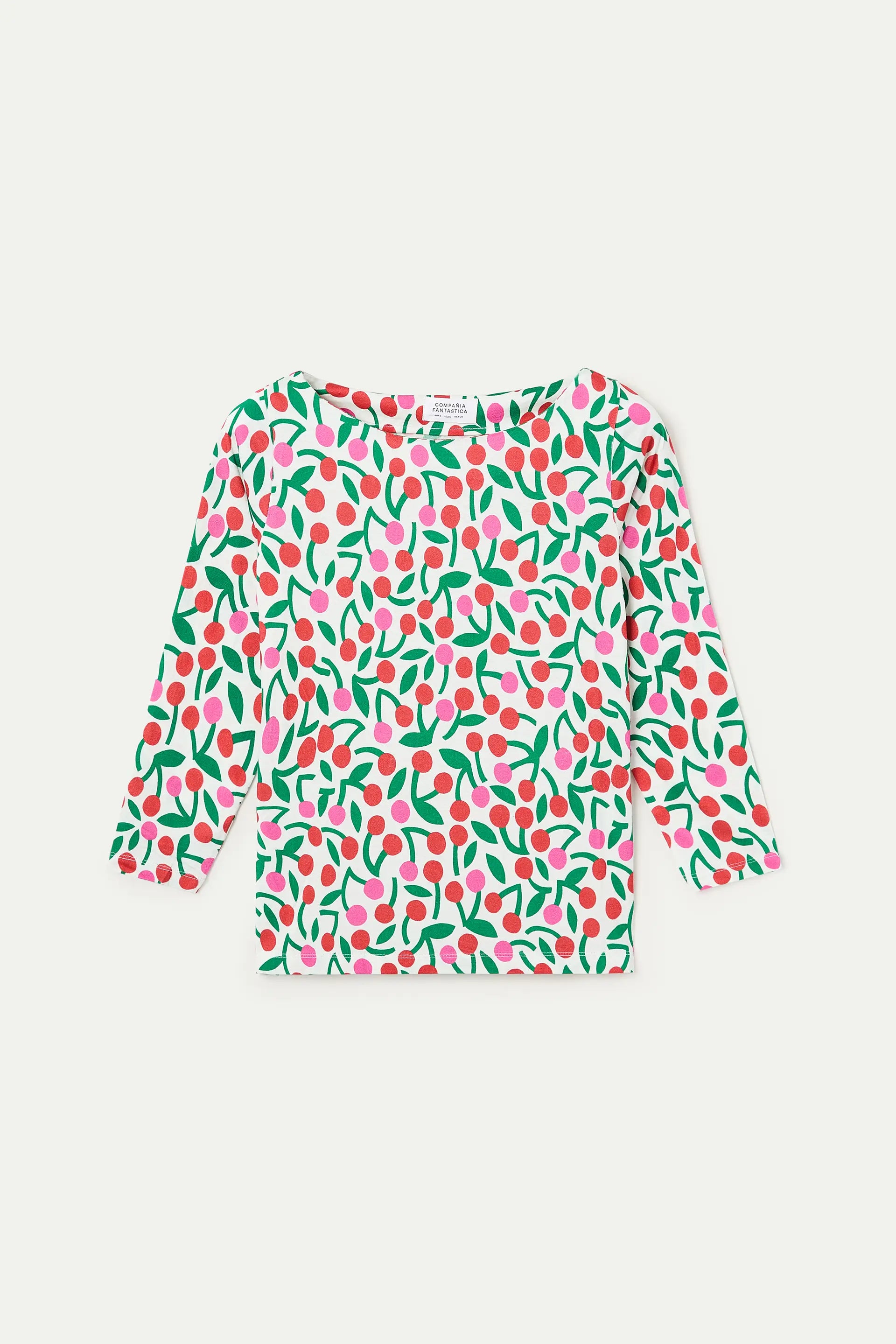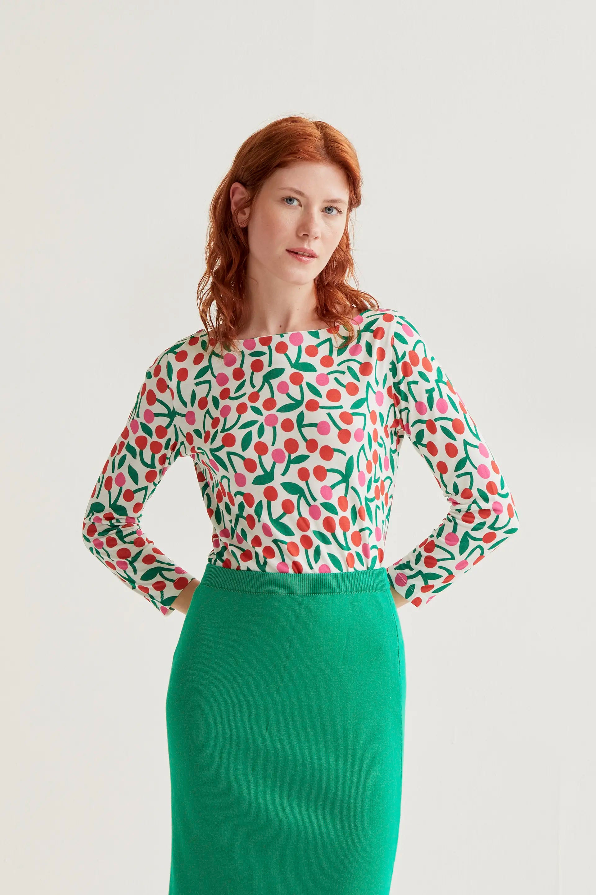 Viscose jersey T-shirt with a cherry print. Boat neck and long sleeves. Slightly dropped shoulders. The model is 175 cm tall and wears size S.