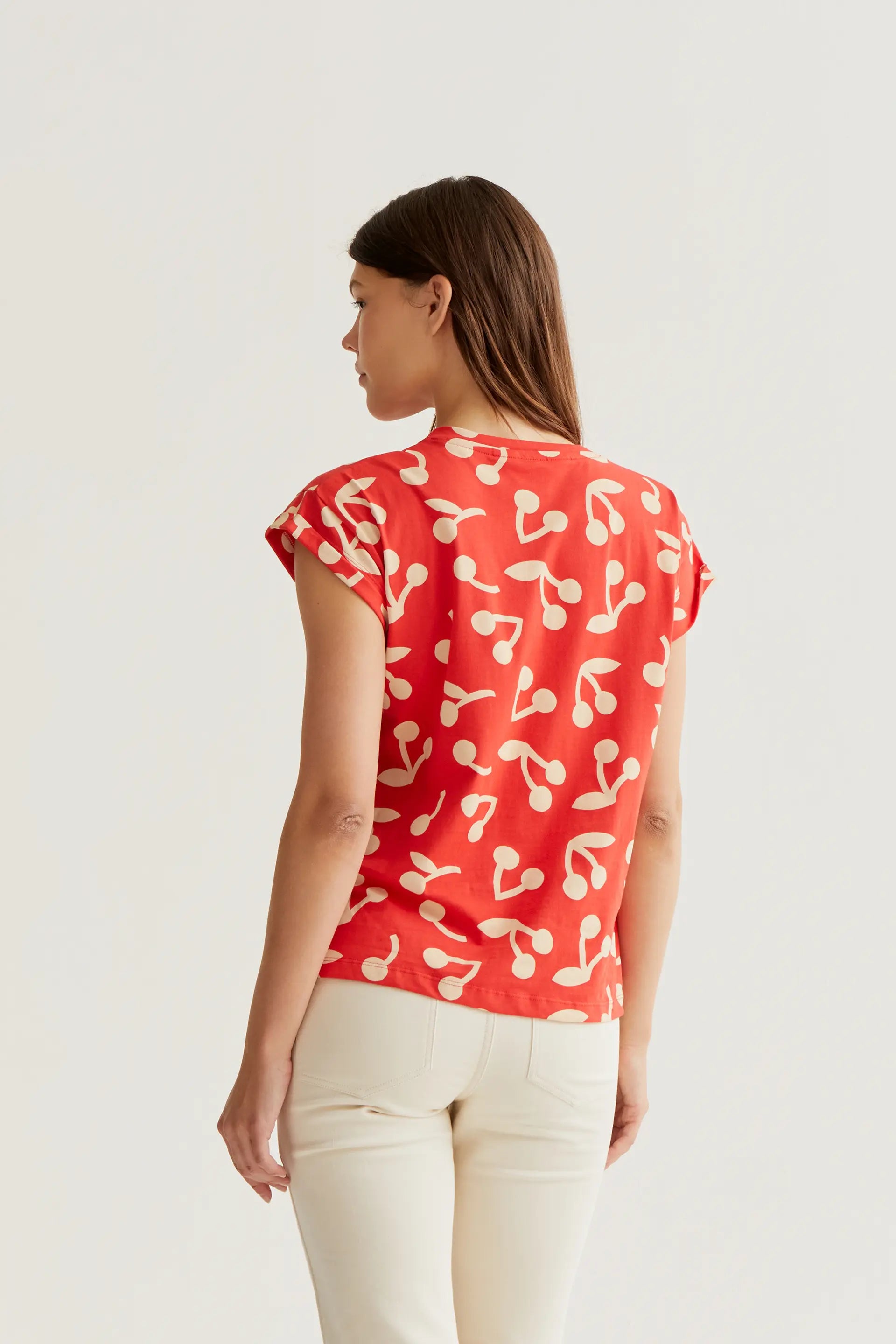 T-shirt made from 100% cotton with a burgundy mesh print. Round neck and short sleeves. The model is 177 cm tall and wears size S.