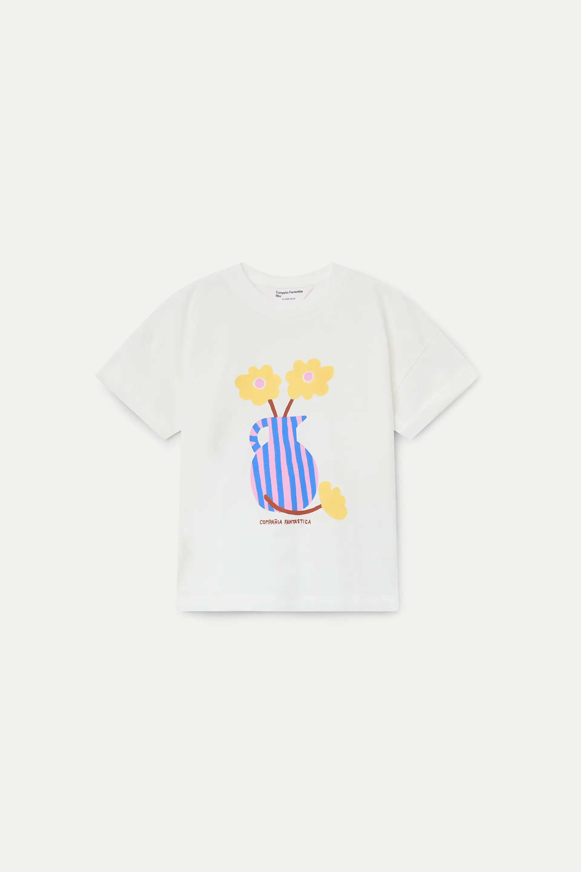 Girls' white t-shirt made from 100% cotton with a "Compañía Fatástica" vase print. Features a round neck, short sleeves with rolled cuffs, and a slightly dropped shoulder. The model is 134 cm tall and wears size 8-9 years.