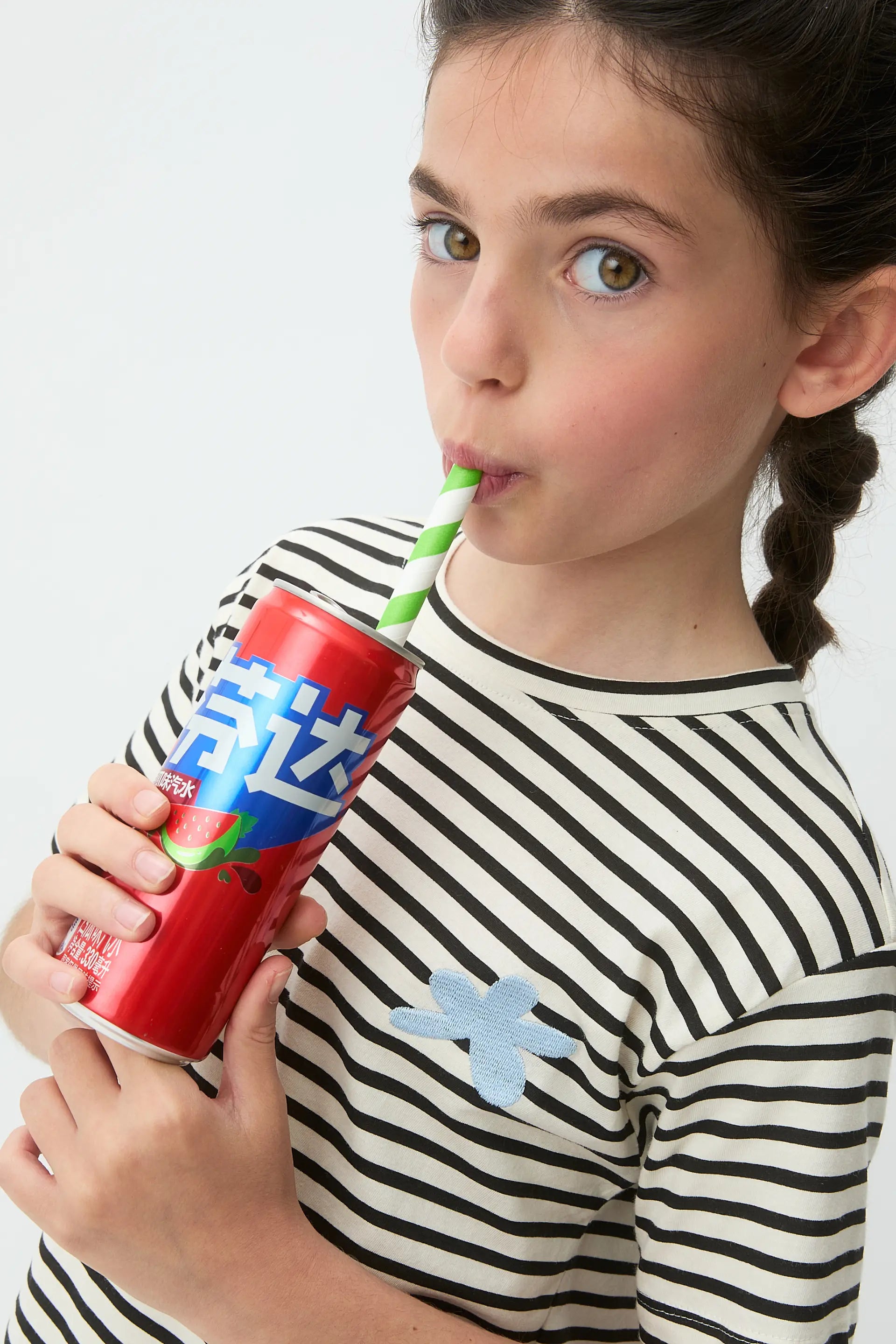 Girls' t-shirt made from 100% cotton with a black and white striped print. Round neck and short sleeves. Slightly dropped shoulder. Flower patch detail. The model is 135 cm tall and wears size 8-9 years.