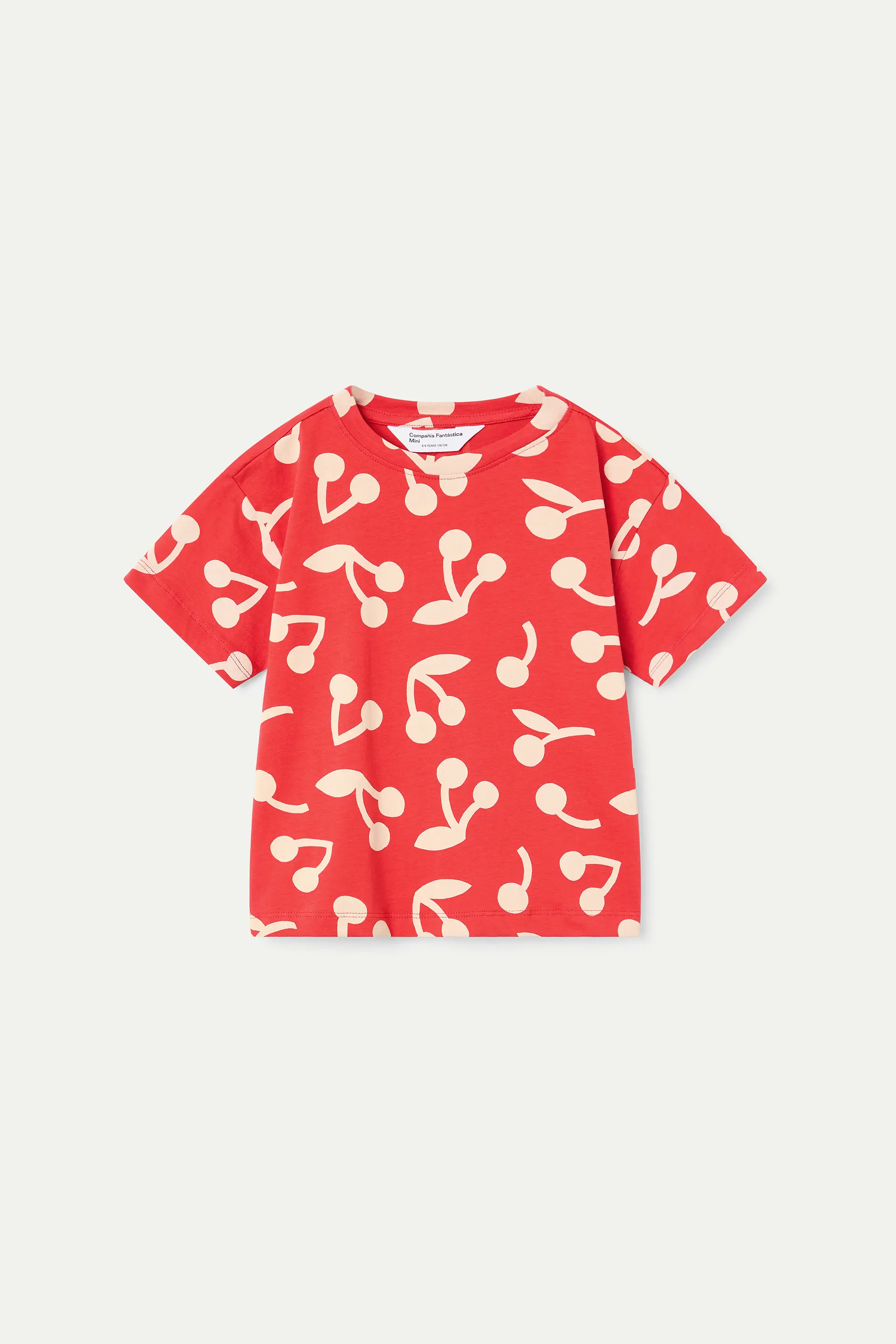 Girls' red t-shirt made from 100% cotton with a cherry print. Round neck and short sleeves. The model is 135 cm tall and wears size 8-9 years.