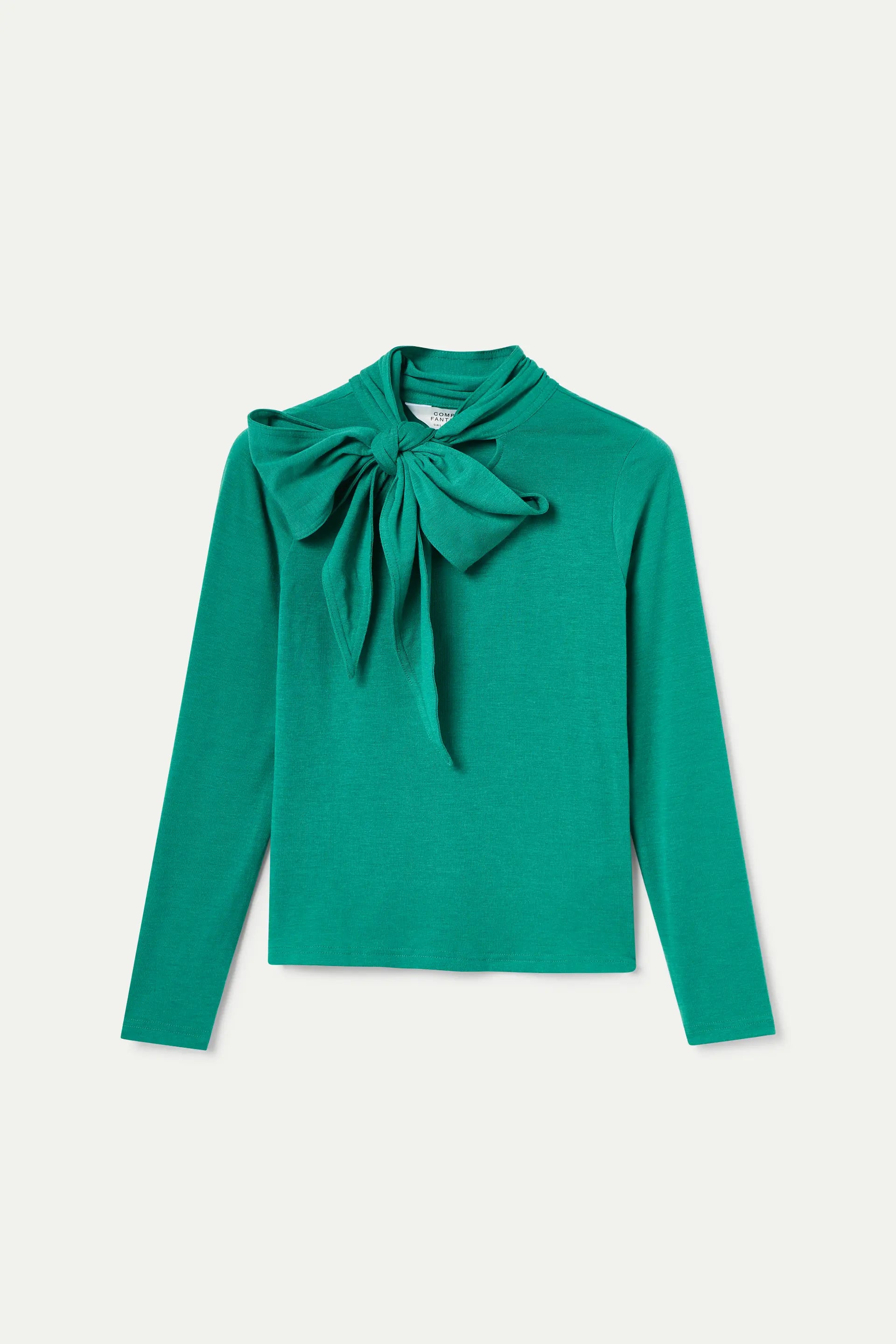 T-shirt with a lightweight green knit fabric. High neck with a bow and long sleeves. The model is 177 cm tall and is wearing a size S.