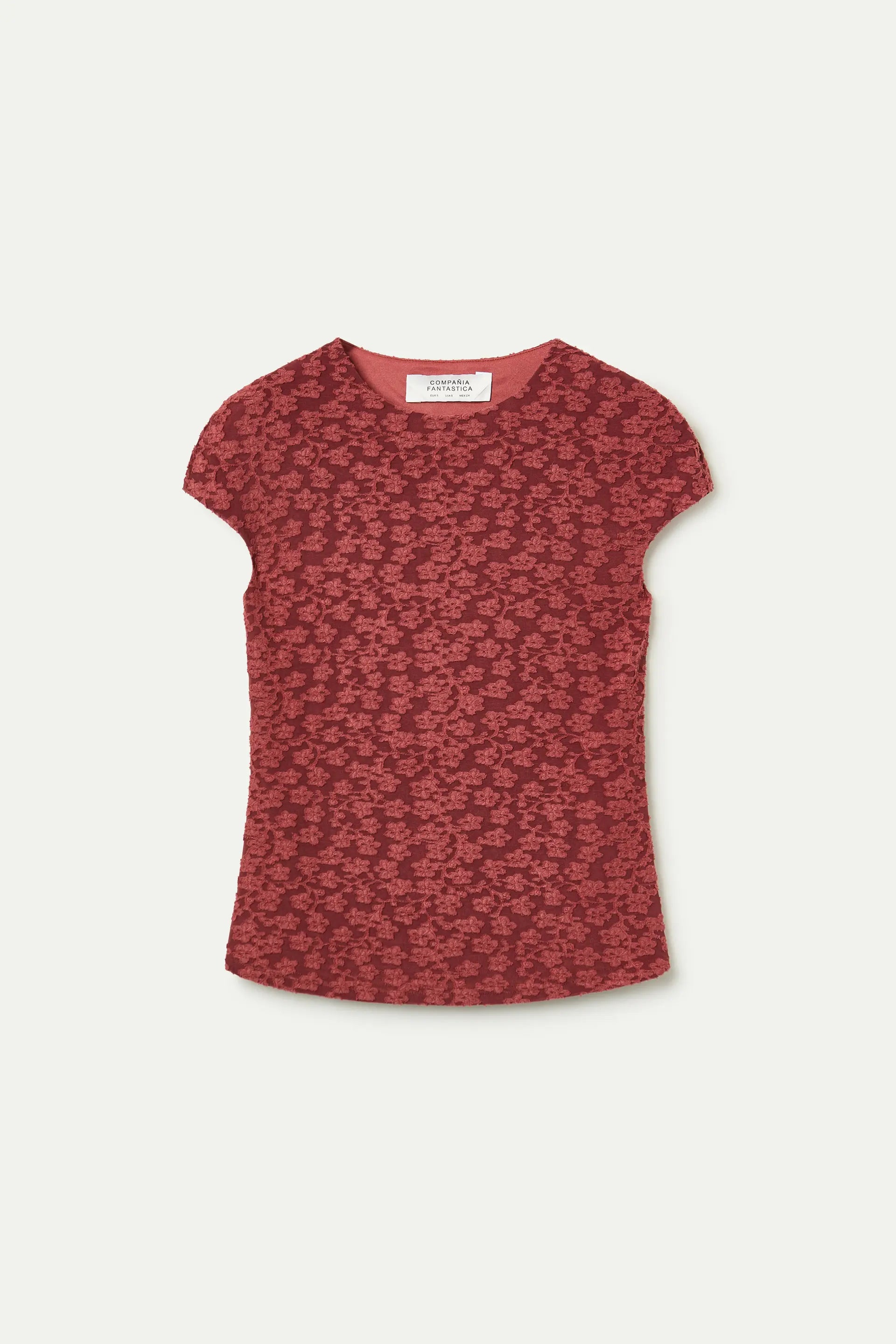 Brown knit and lace T-shirt. Featuring a high neckline and long sleeves. Lined. The model is 177 cm tall and is wearing a size S.