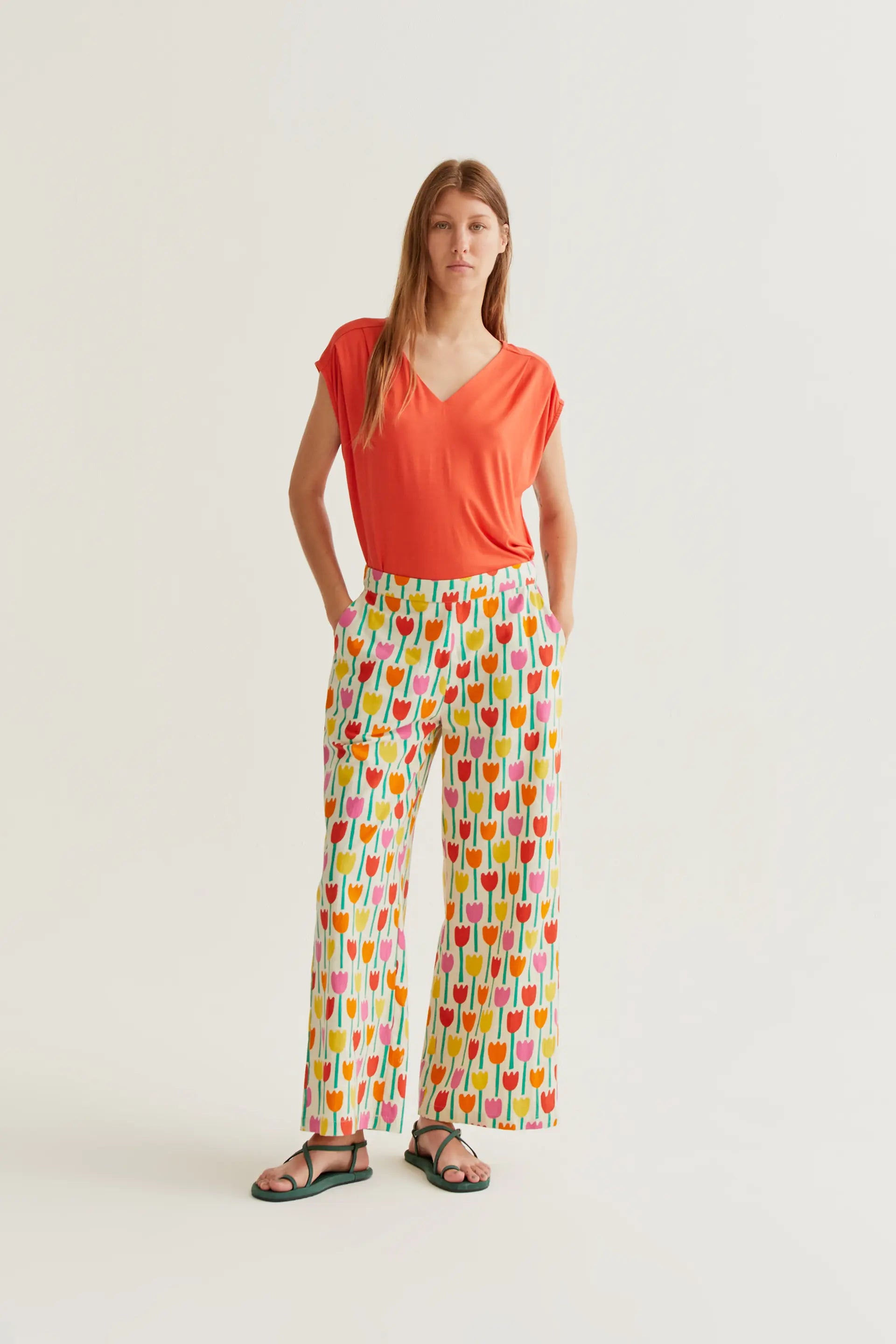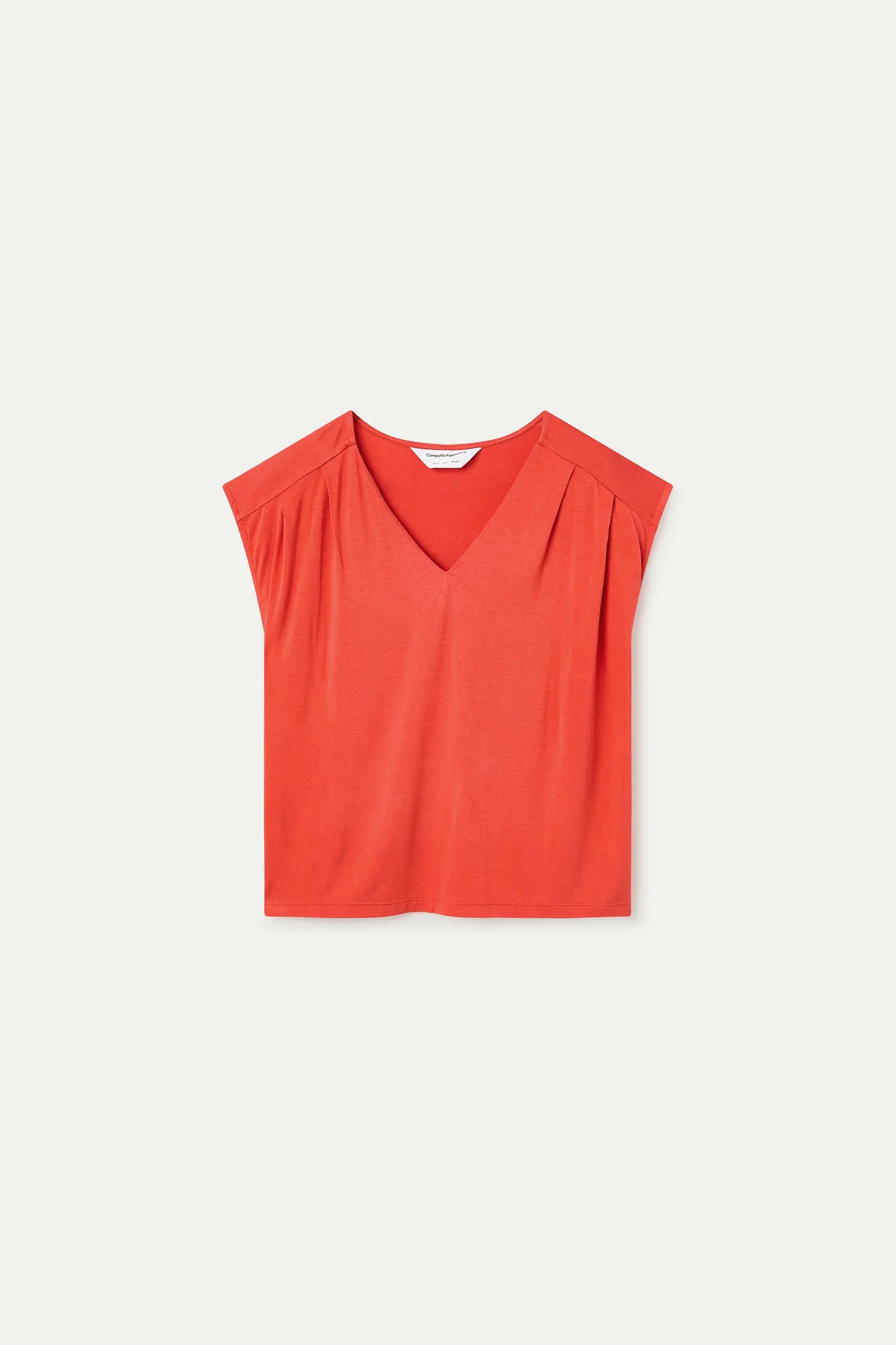 Red T-shirt with black bamboo jersey fabric. V-neck and sleeveless. The model is 177 cm tall and wears size S.