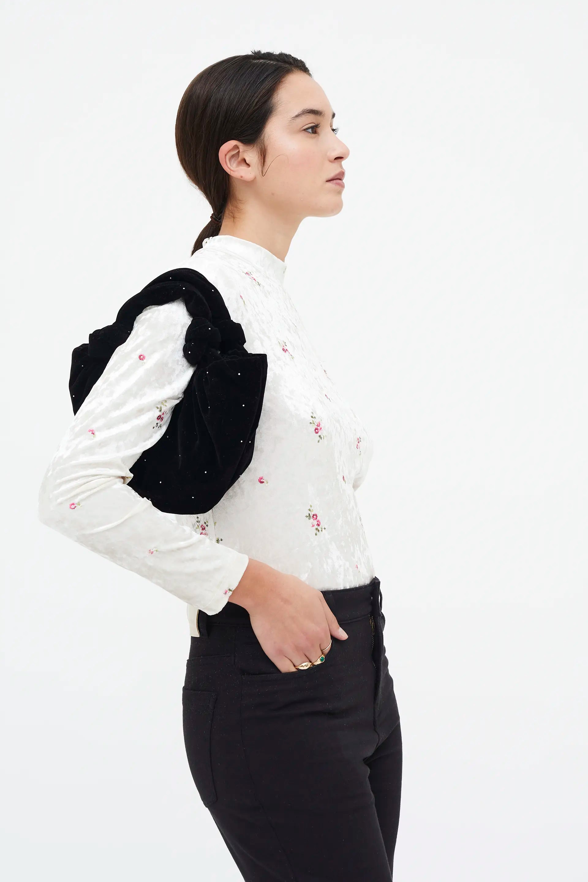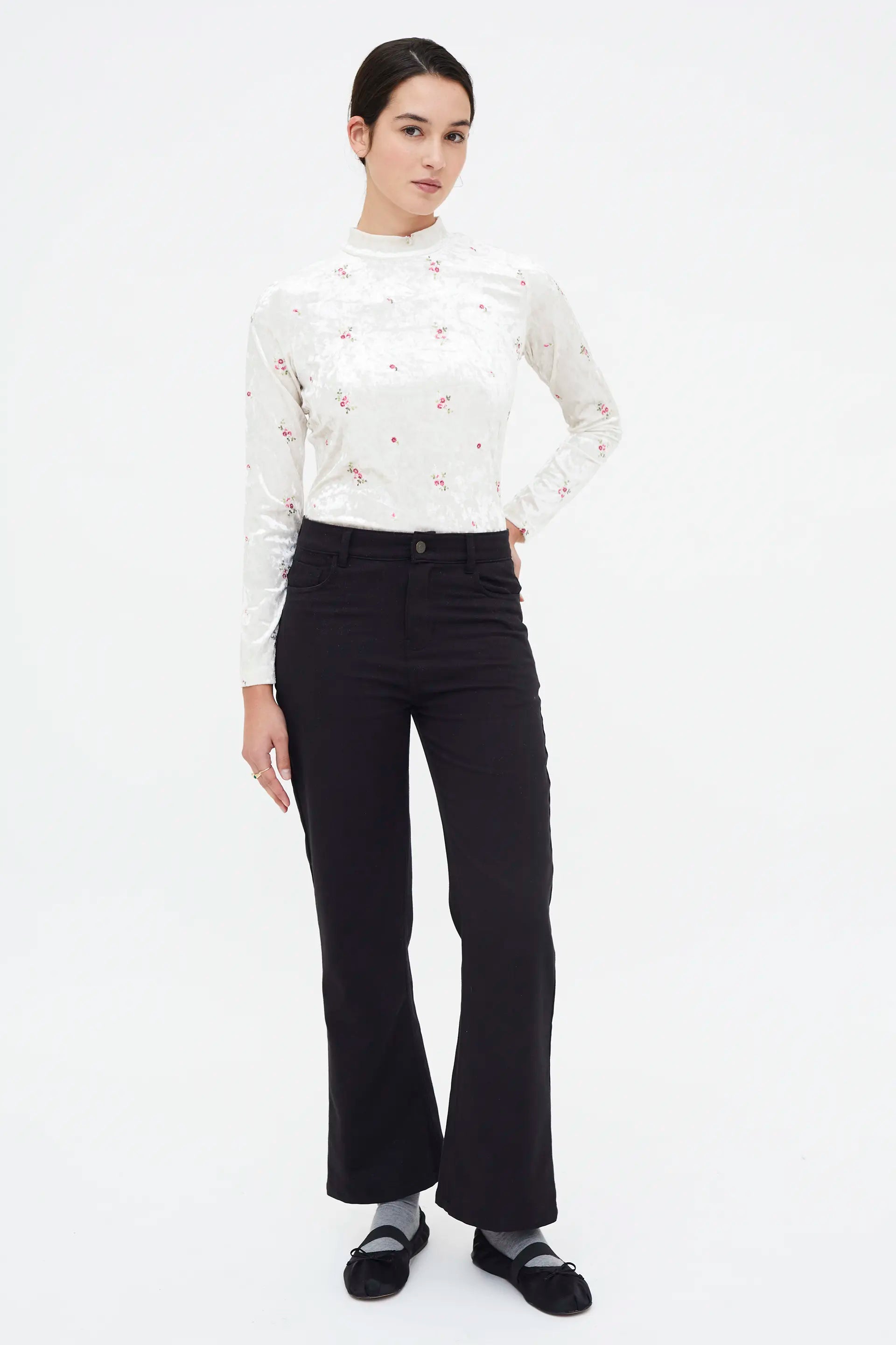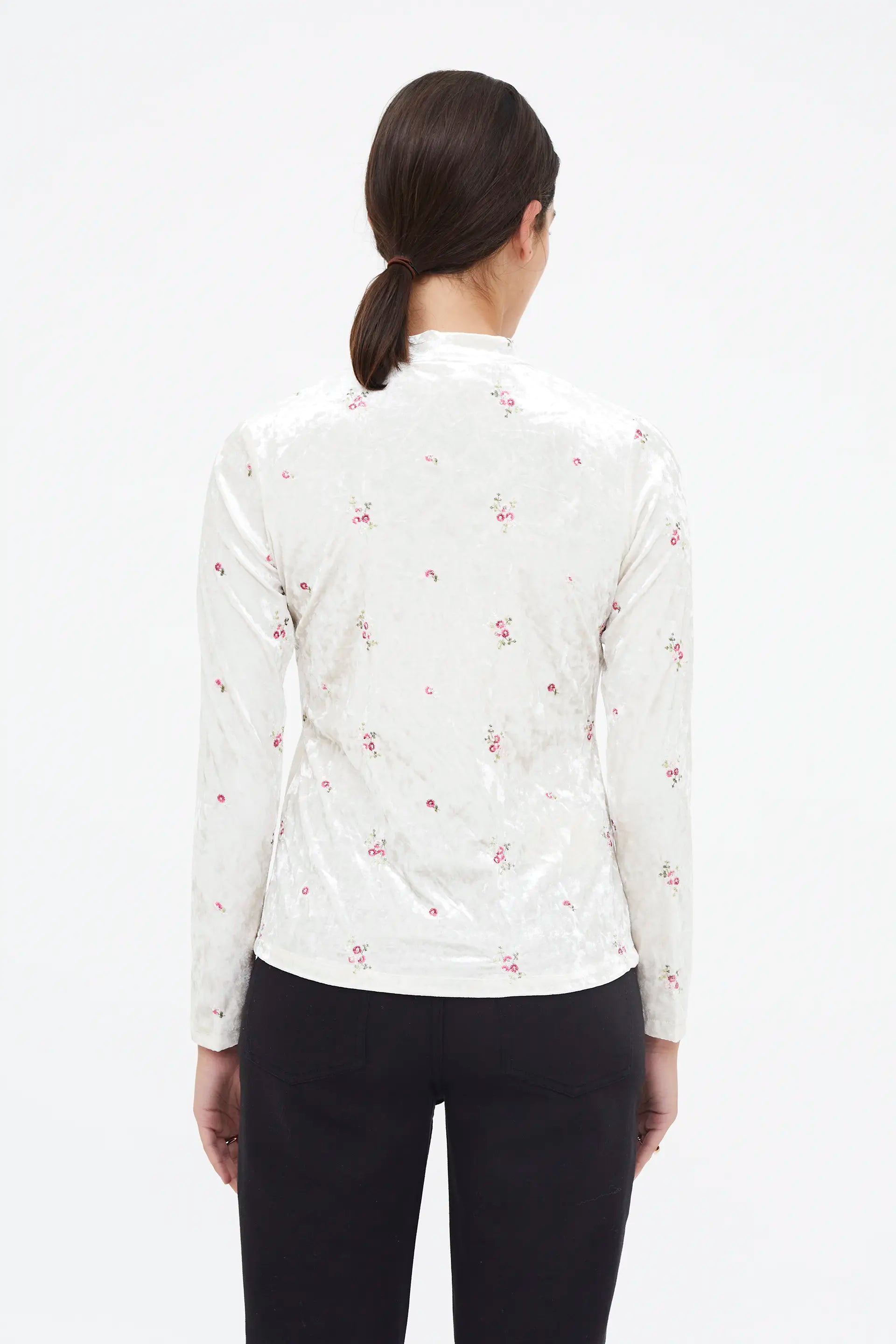 Velvet T-shirt with floral embroidery. Mock neck and long sleeves. The model is 177 cm tall and is wearing a size S.