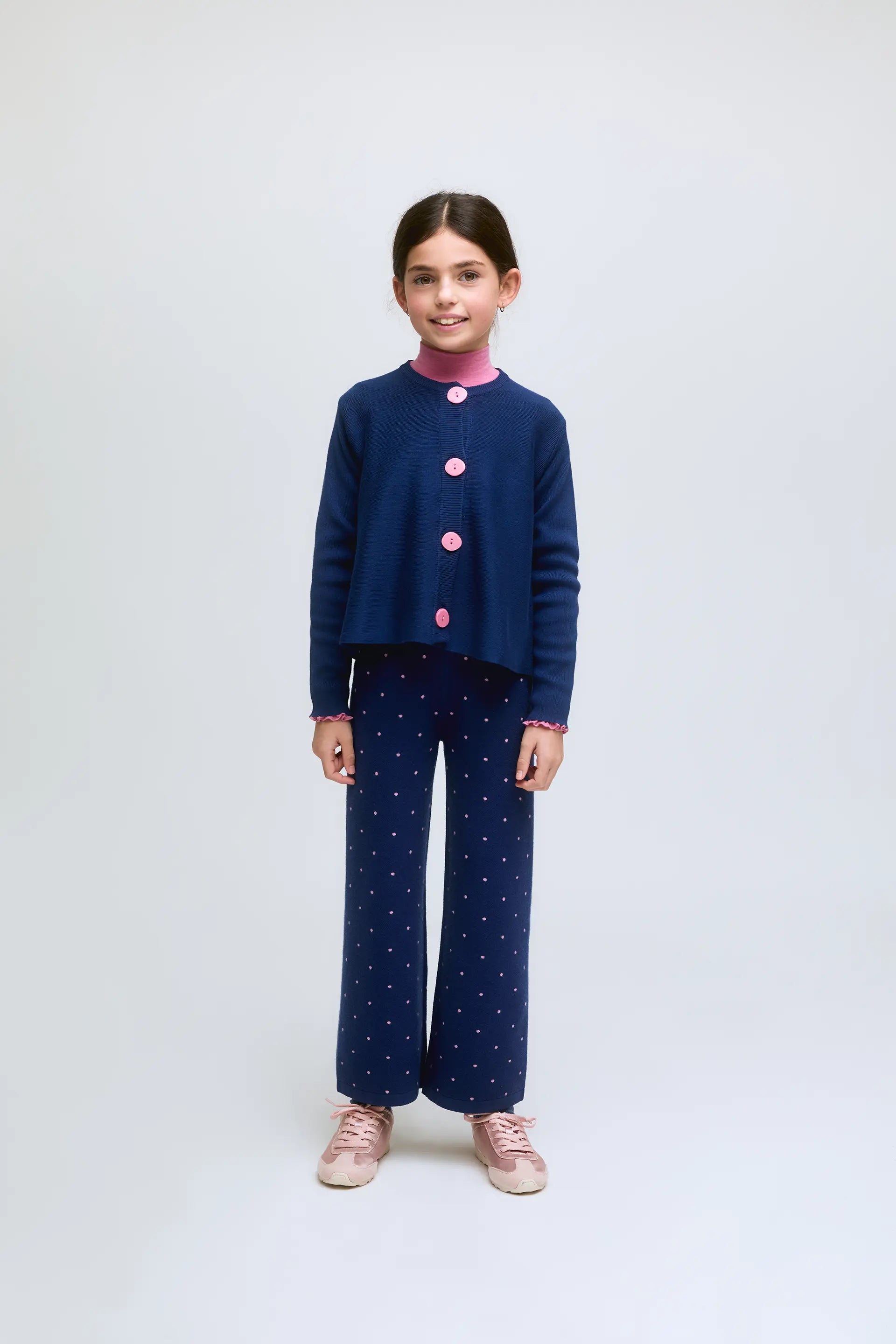 Navy blue fine knit girl's cardigan with contrasting buttons
