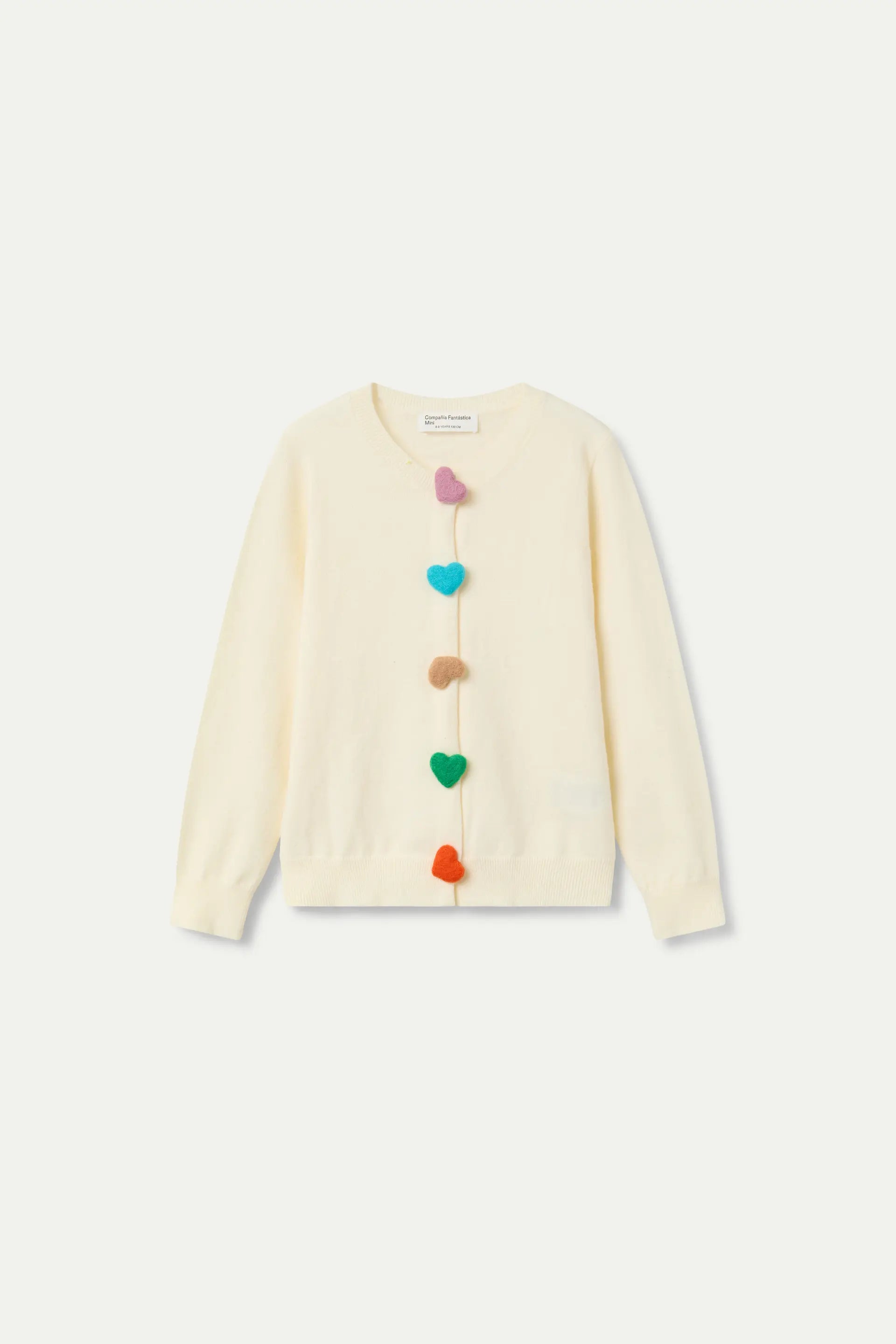 Off-white knitted girls' cardigan with a round neck and long sleeves. Front closure with multicolored heart-shaped buttons.