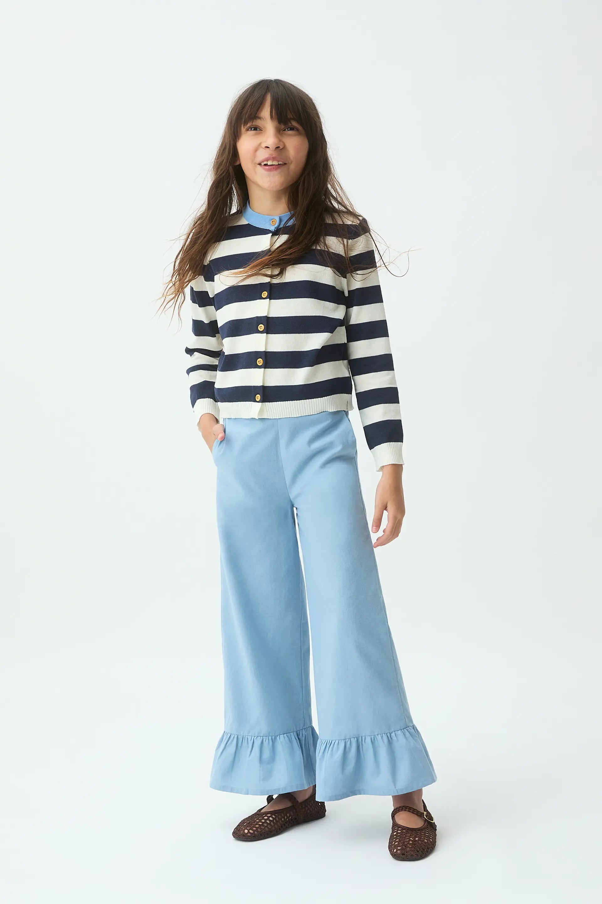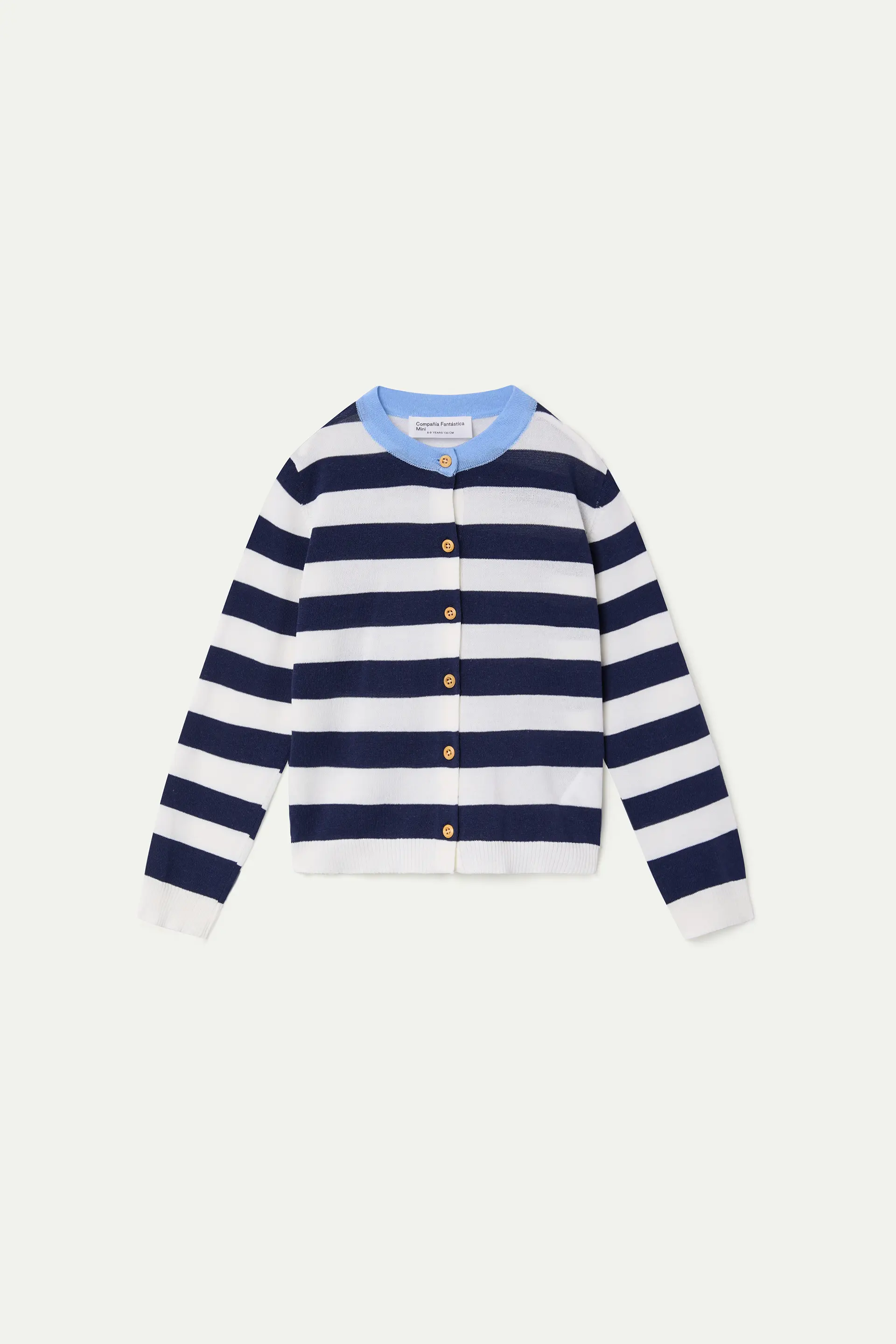 Girl's cardigan with white and blue striped knit fabric. Round neck in light blue and long sleeves. Front button fastening in yellow. Ribbed finishes. The model is 136 cm tall and wears size 8-9 years.