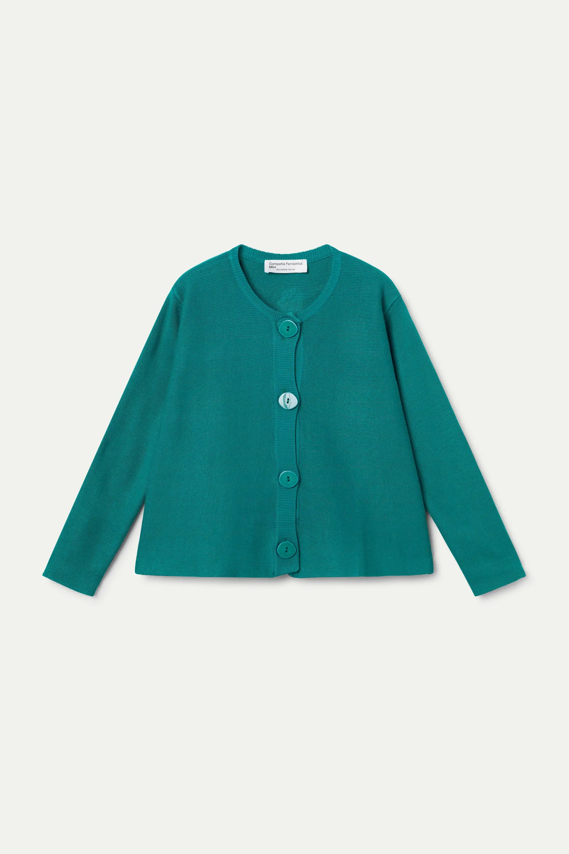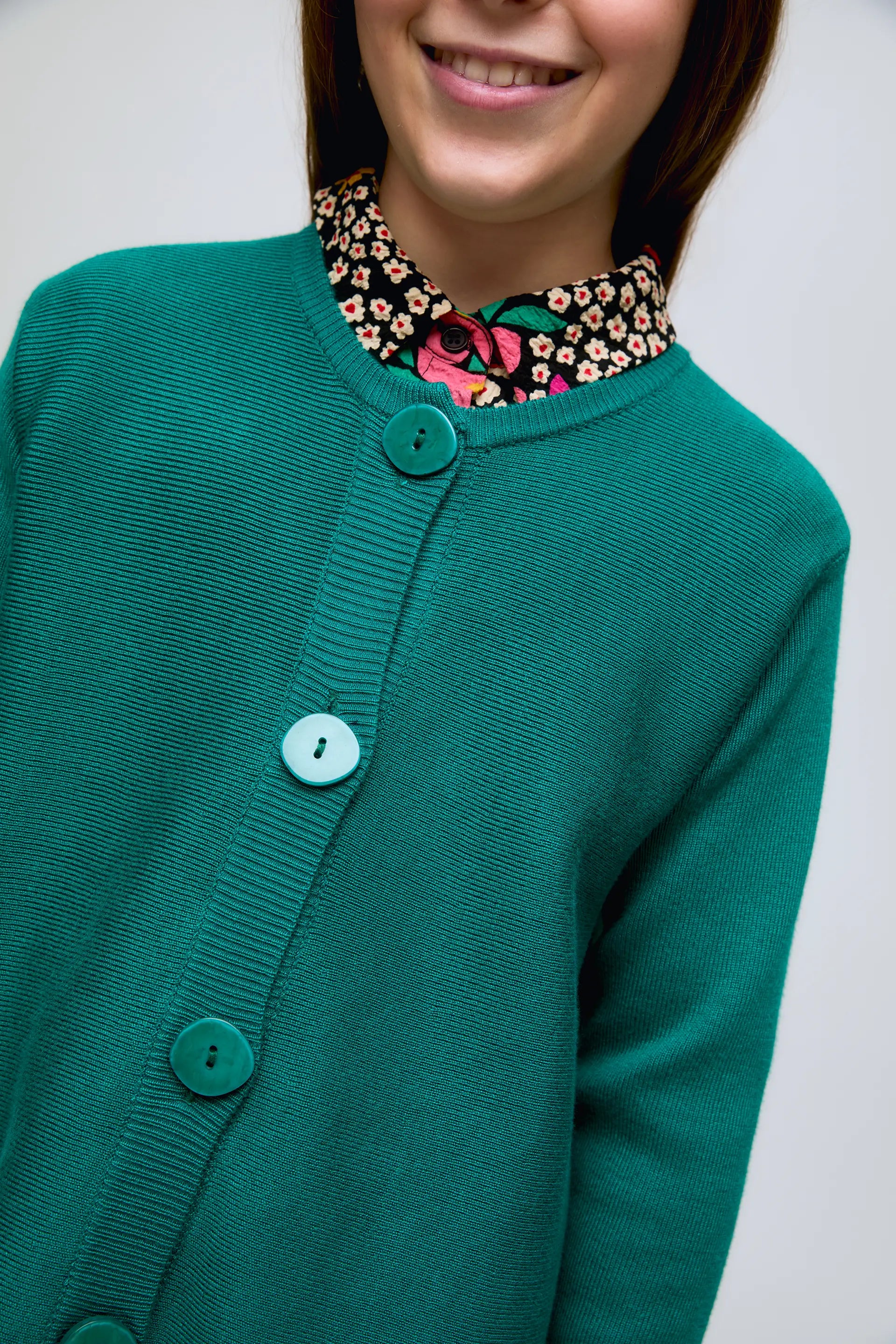 Girls' green flared knit cardigan with a round neck and long sleeves. Large front button closure.