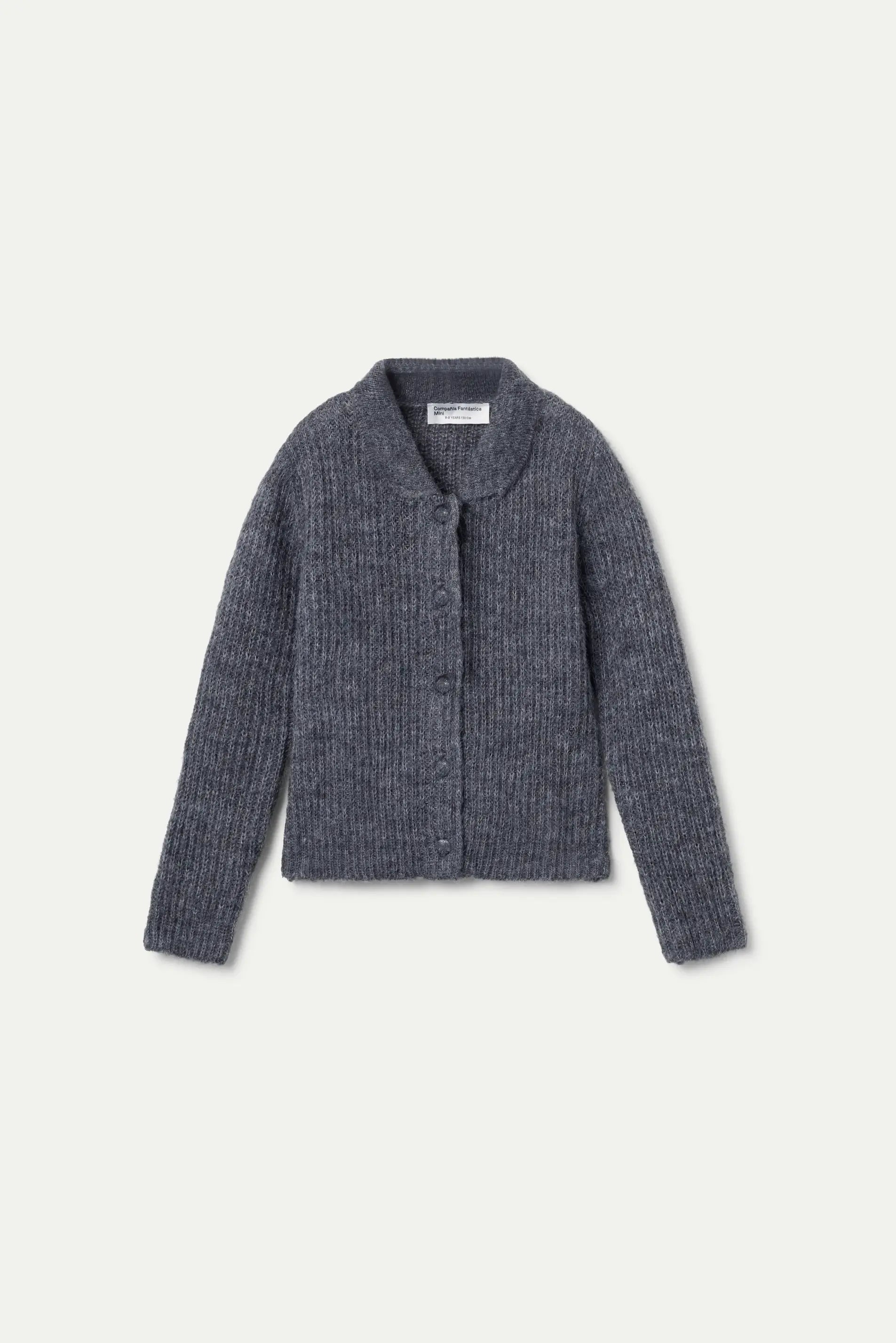 Girls' grey knitted cardigan with a bow at the neck and buttons down the front.