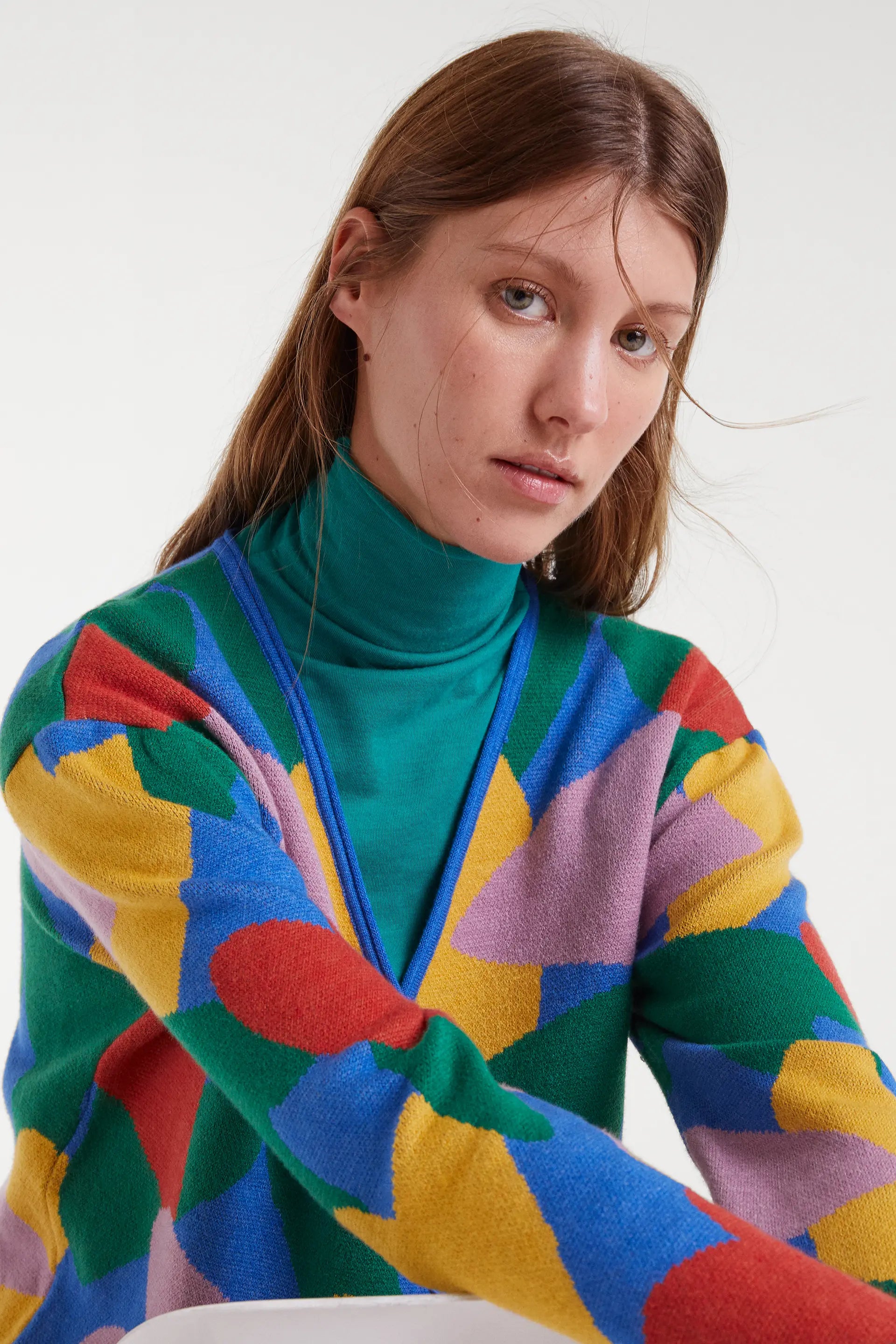 Jacquard cardigan with a Cupid print. V-neck and long sleeves. Button-front closure. The model is 177 cm tall and is wearing a size S.
