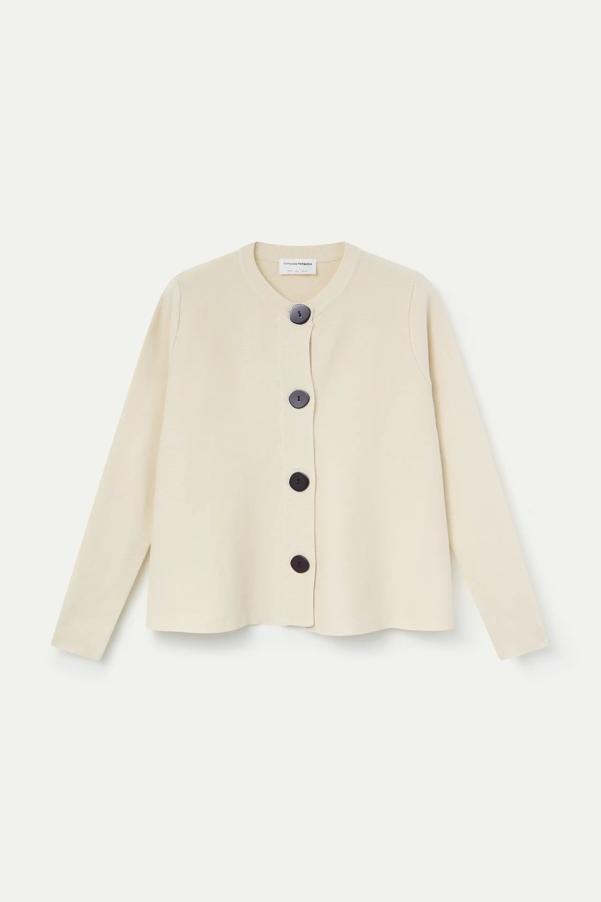 Beige knit cardigan. Round neck and long sleeves. Front button closure with black buttons. Ribbed trim details. The model is 175 cm tall and wears size S.