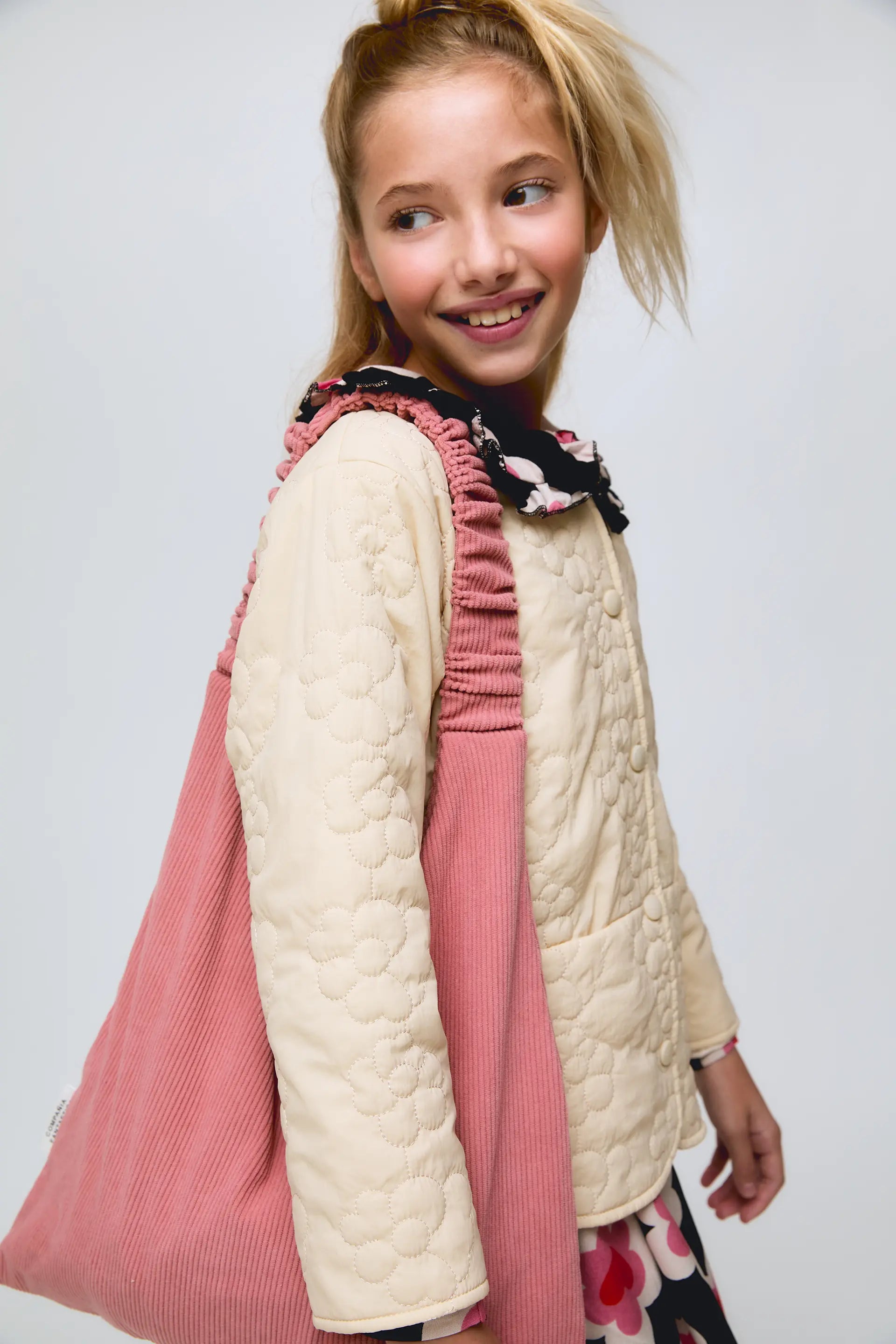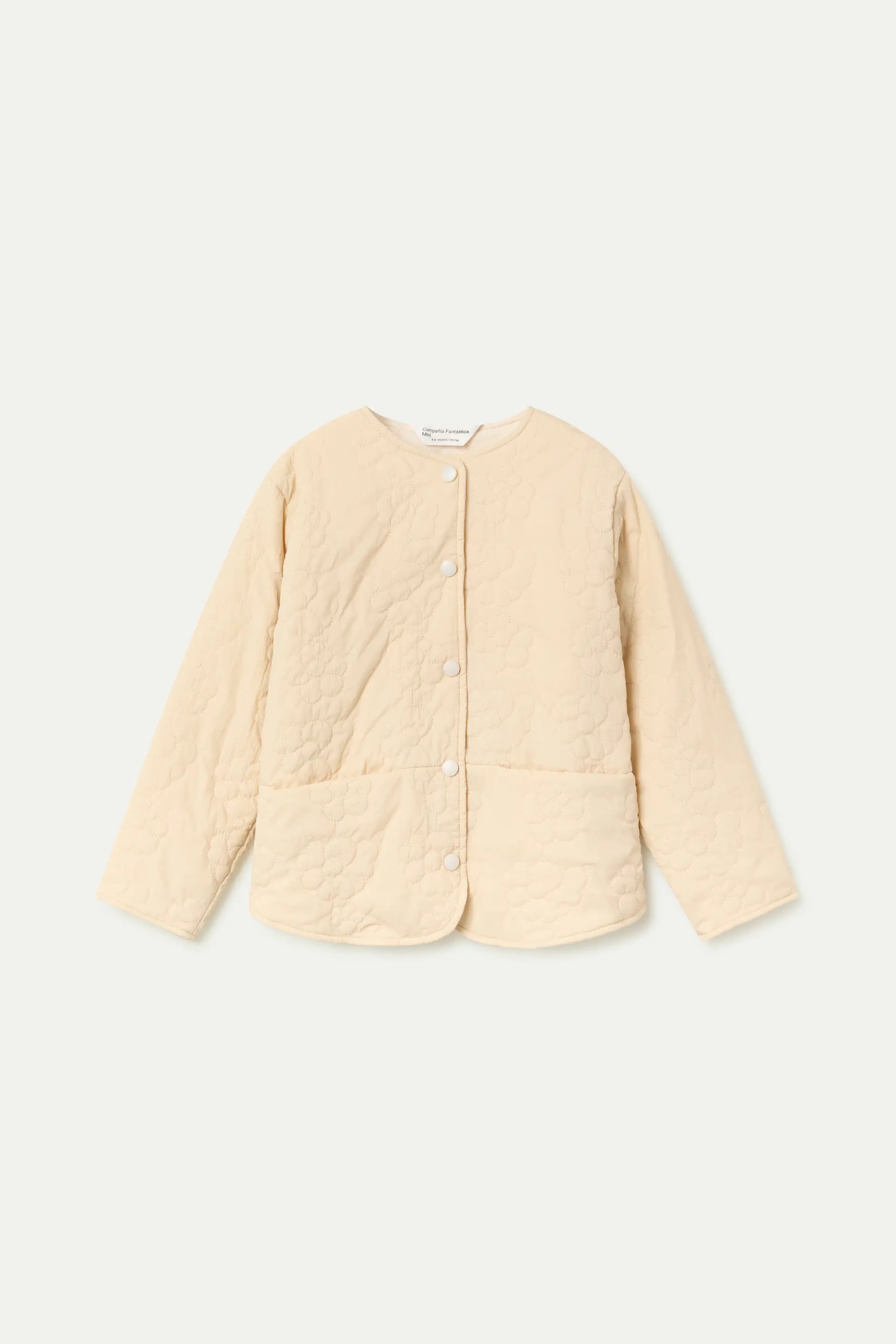Light beige girls' quilted jacket. Featuring a round neck, long sleeves, and front pockets. Snap-button closure at the front. A minimalist style with a quilted texture and soft contours.
