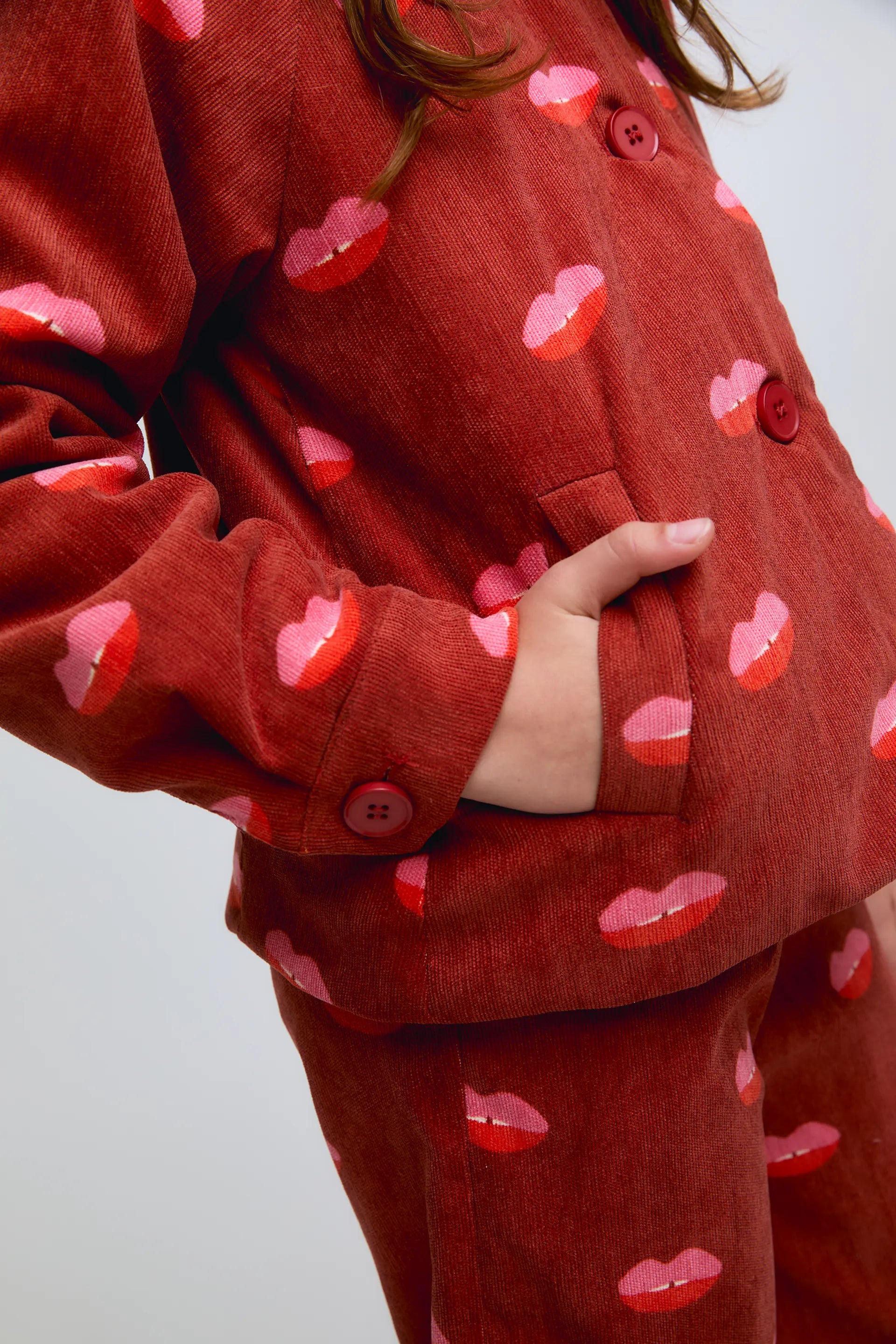 Girls' jacket in soft, rust-colored corduroy with a Lips print. Featuring a shirt collar, long sleeves, and a contrasting button fastening at the front. Side pockets and a slightly elastic hem for added comfort.