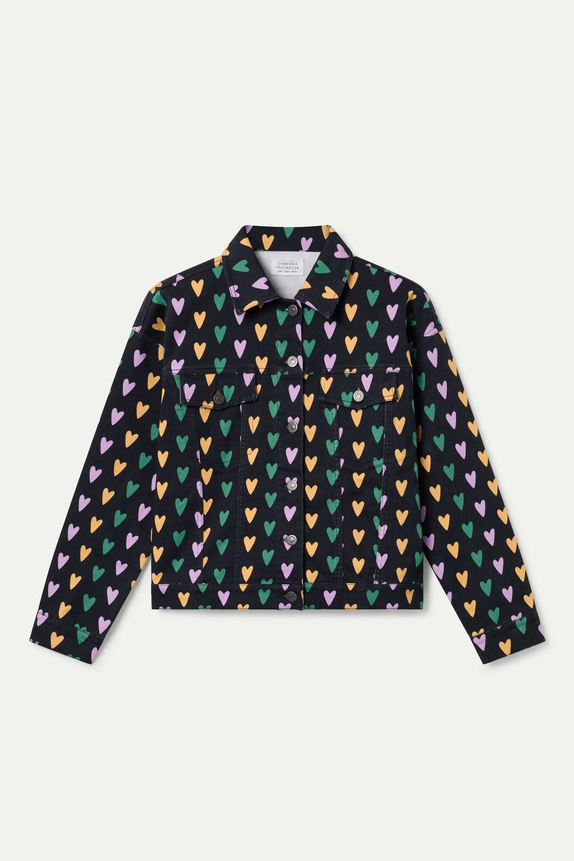 Stretch denim jacket with a Cupid Lines print. Featuring a lapel collar and long sleeves with buttoned cuffs. Slightly dropped shoulders. Front flap pockets with buttons. The model is 177 cm tall and is wearing a size S.