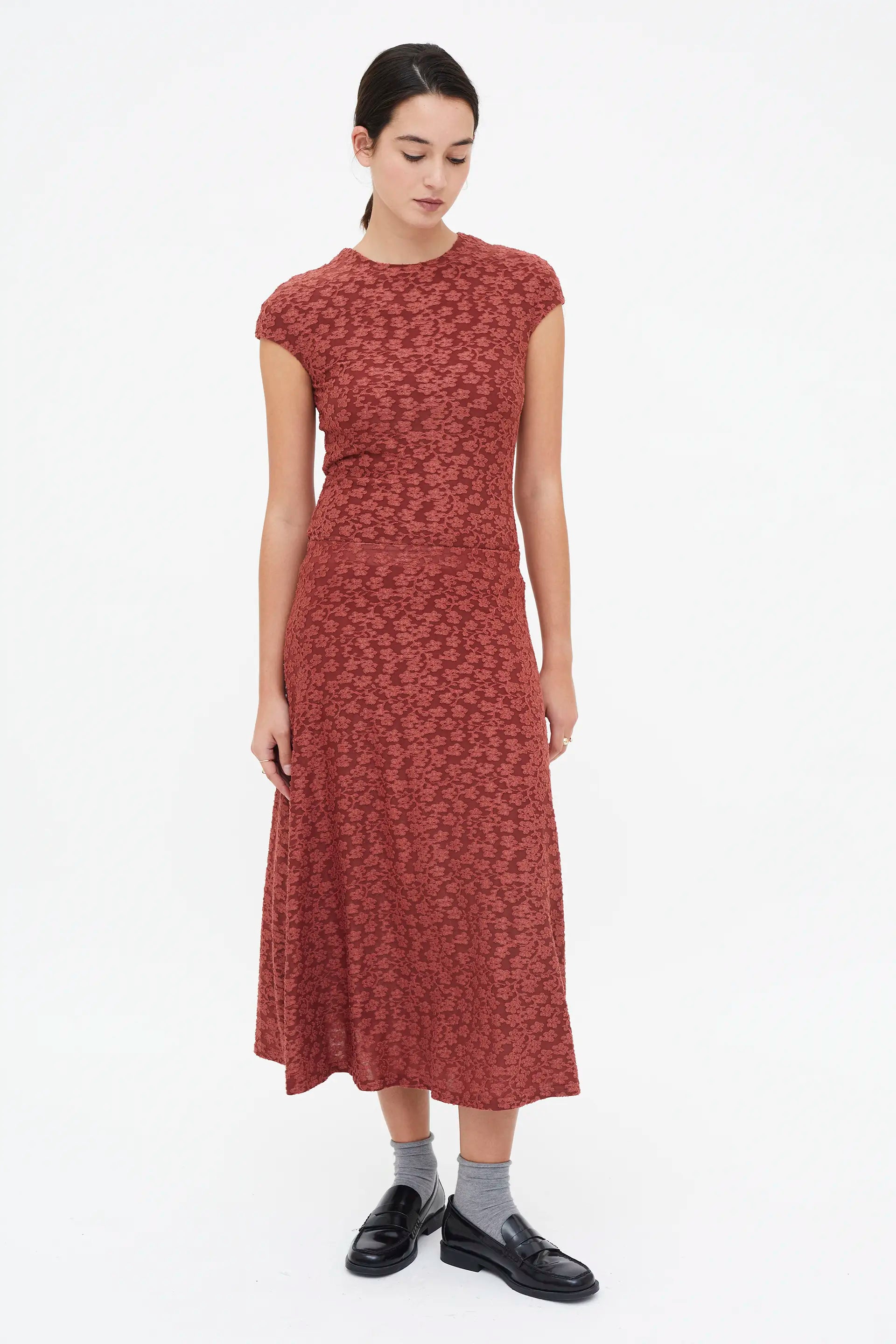 Brown knit and lace midi skirt. High-rise, fixed waist. Lined. The model is 177 cm tall and is wearing a size S.