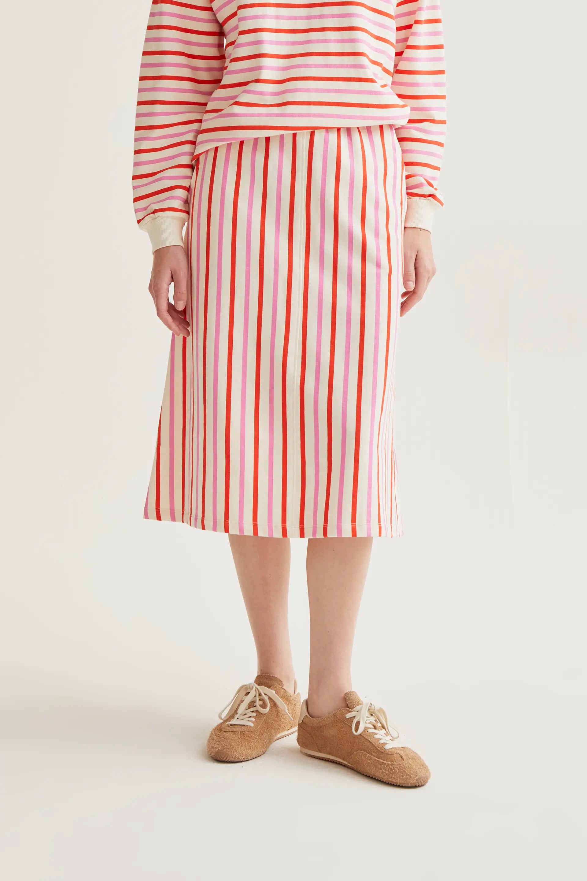Midi skirt with pink and red striped print