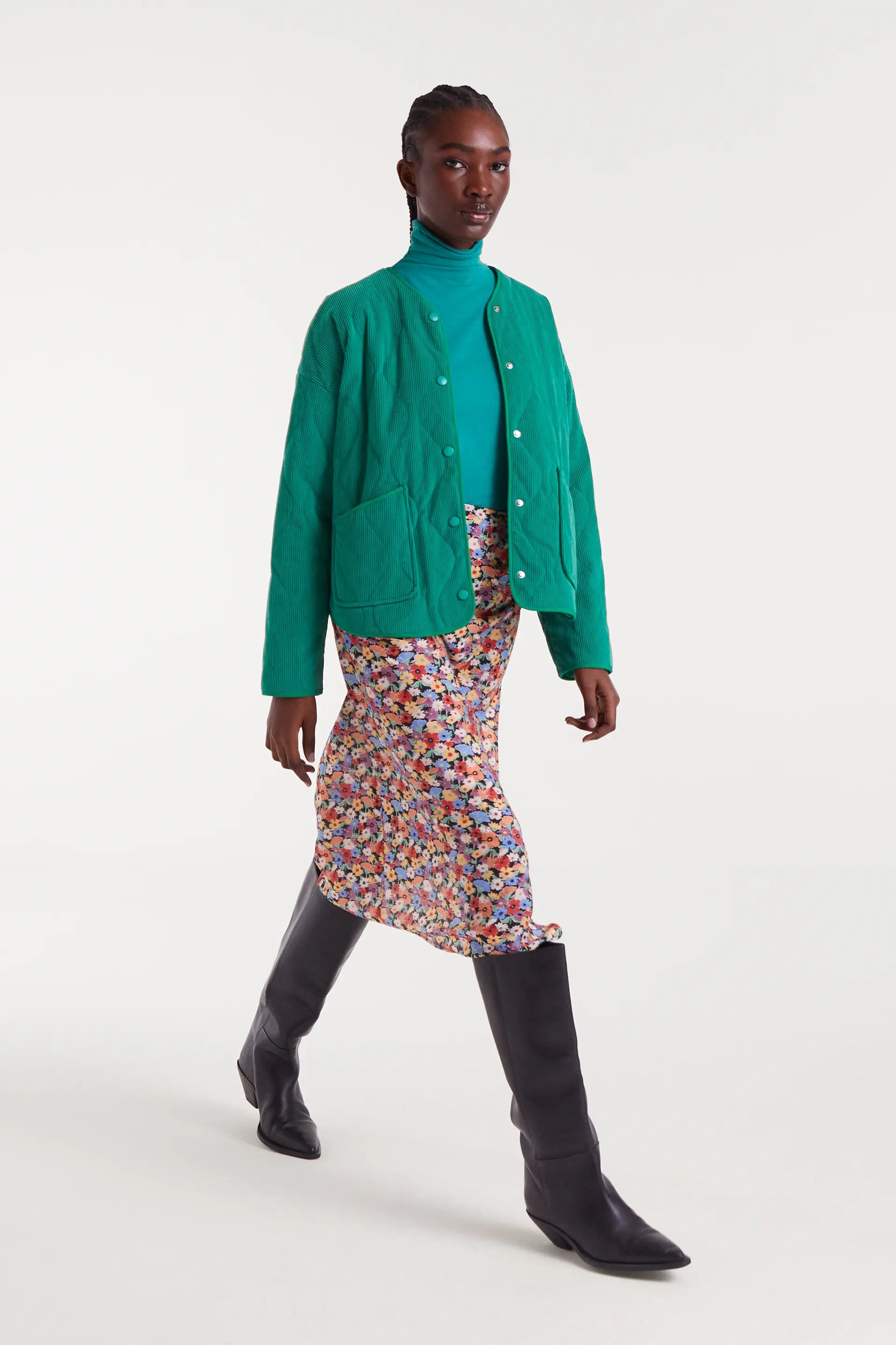Lightweight crepe midi skirt with a Hampton Small print. Wraparound elastic waistband at the back. Side gathers. The model is 178 cm tall and is wearing a size S.