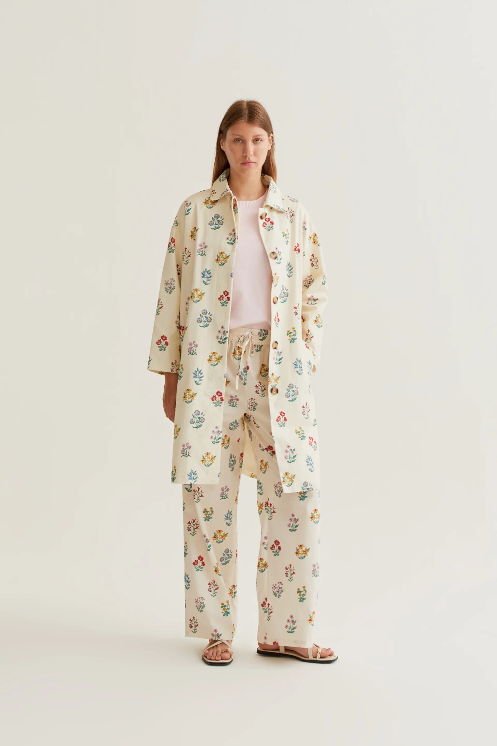 Trench coat in 100% cotton with a gardener print. Lapel collar and long sleeves. Slightly dropped shoulders. Two-tone concealed button front closure. Side pockets. Lined. The model is 177 cm tall and wears size S.