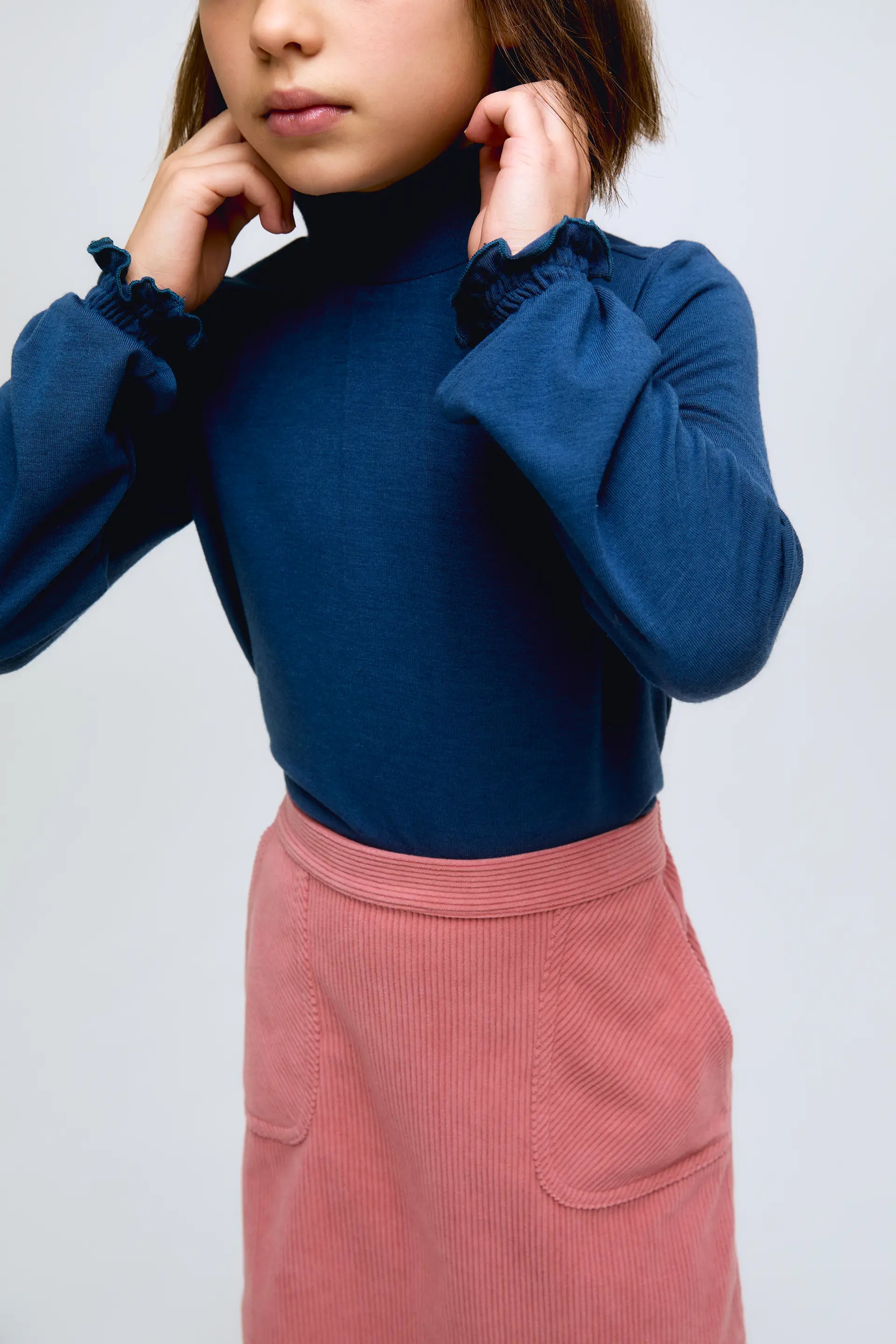 Fine knit blue sweater with long sleeves, high neck and elastic gathered cuffs.