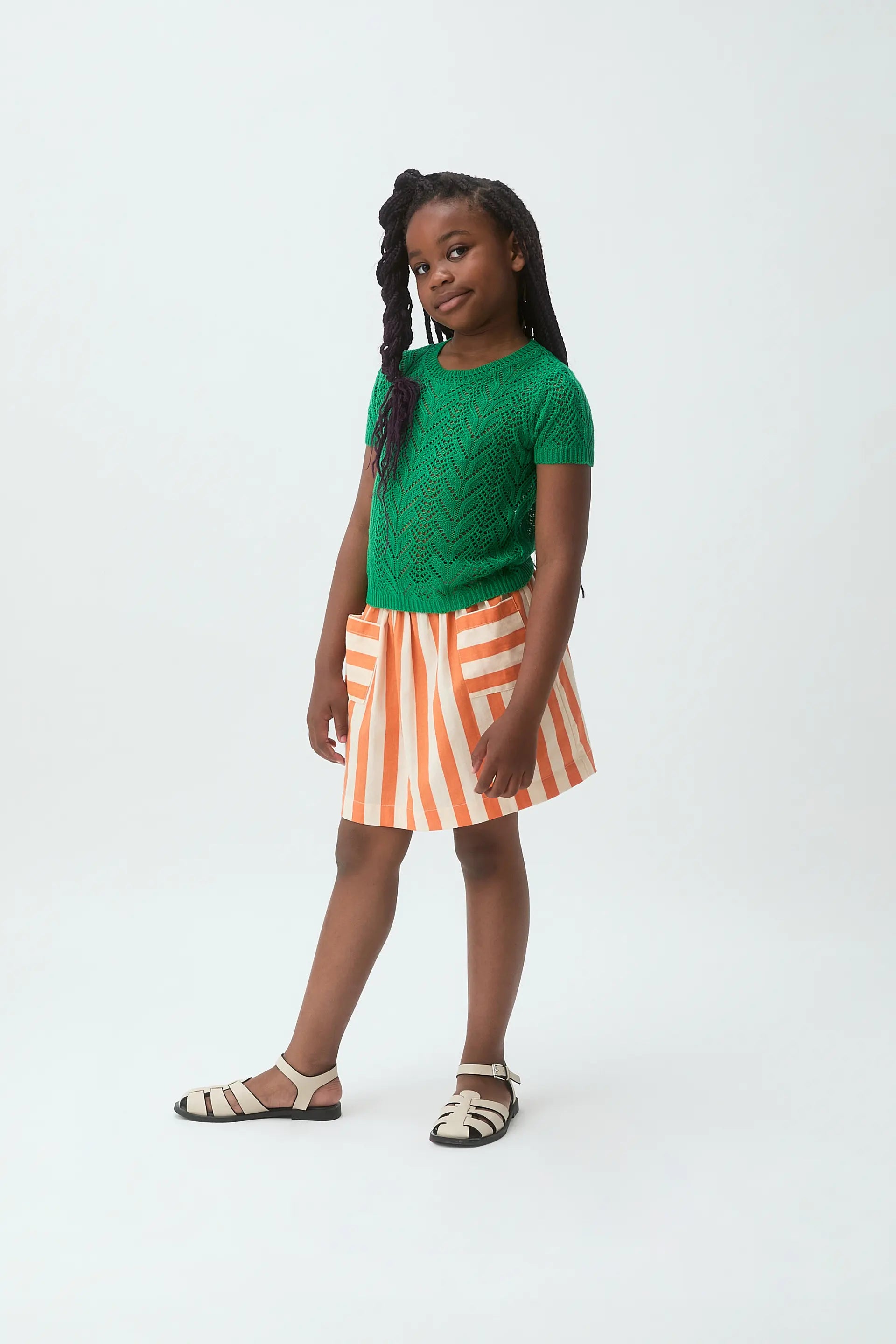 Girls' green knit sweater with embroidered details. Round neck and short sleeves. Ribbed trim. The model is 133 cm tall and wears size 8-9 years.