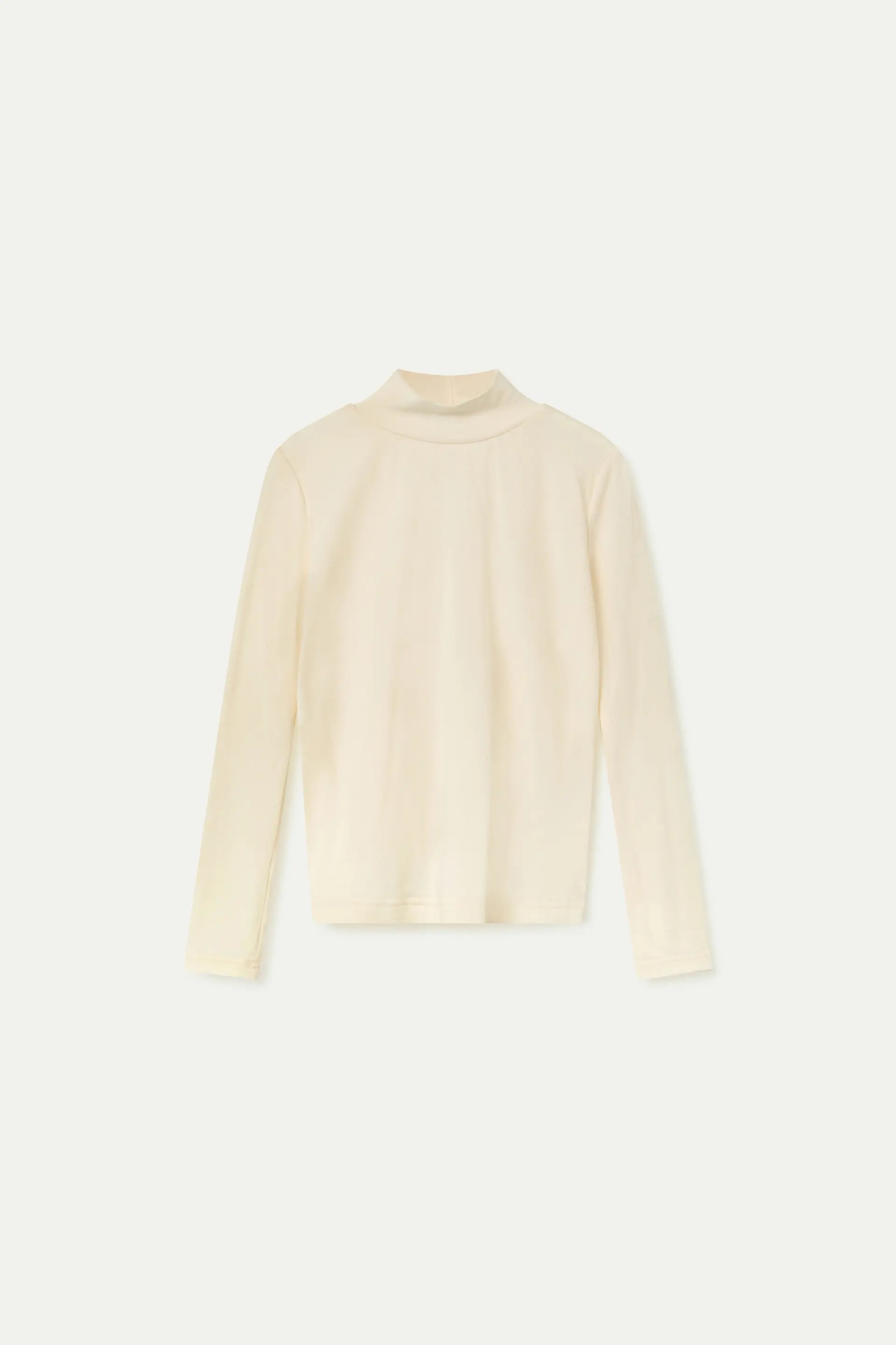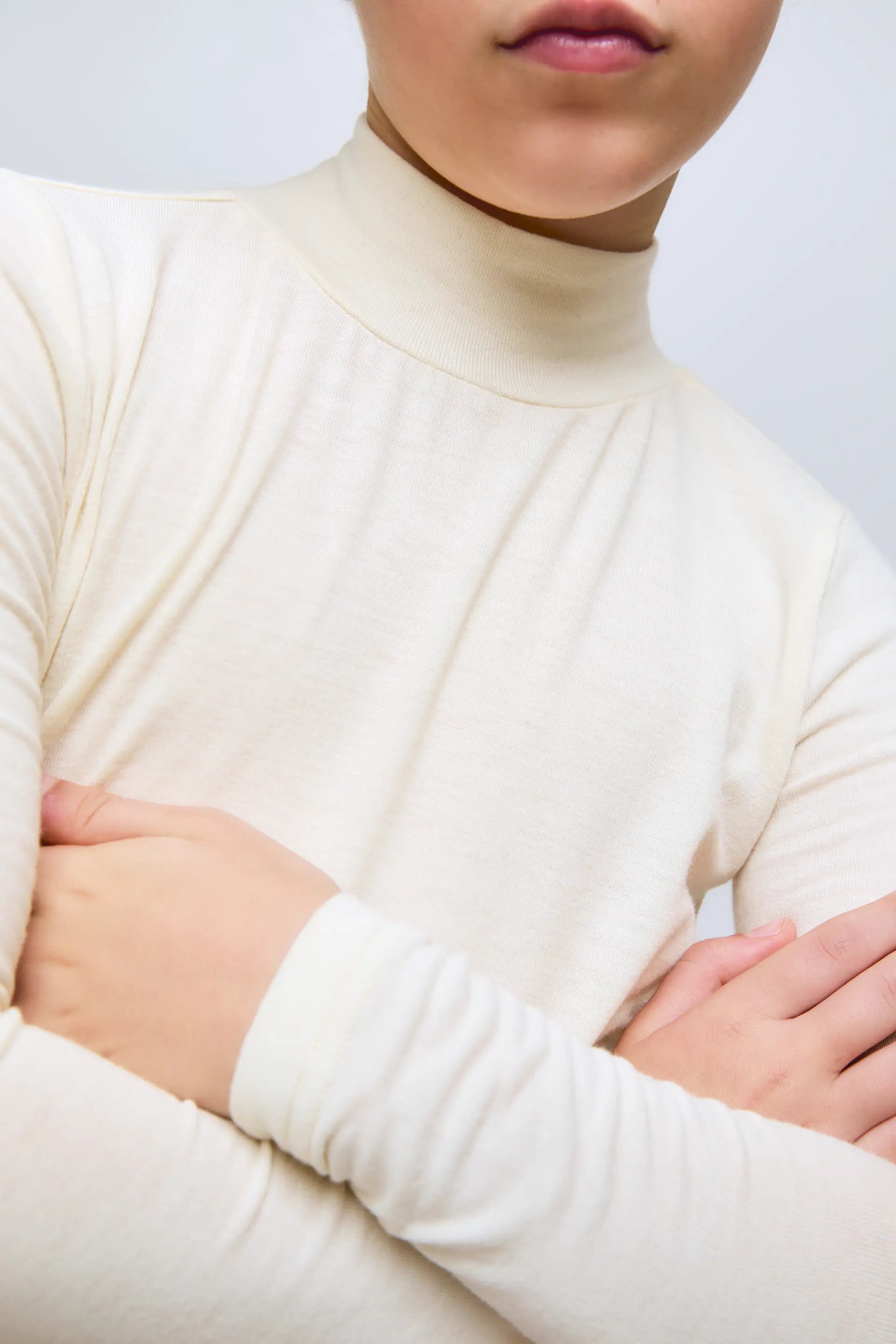 Fine knit girl's sweater in white with a high neck and long sleeves.