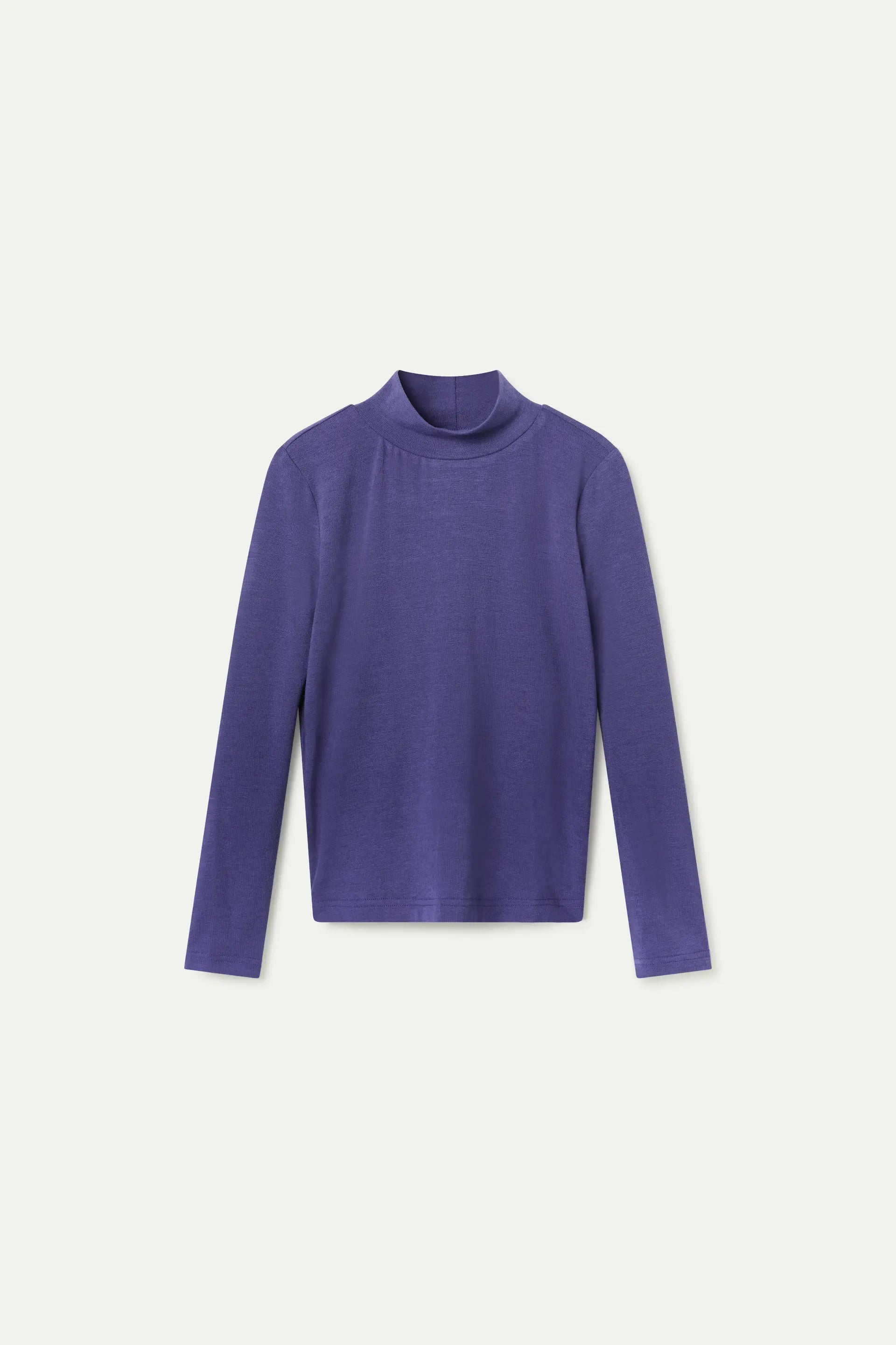 Fine knit girl's sweater in purple with a high neck and long sleeves.