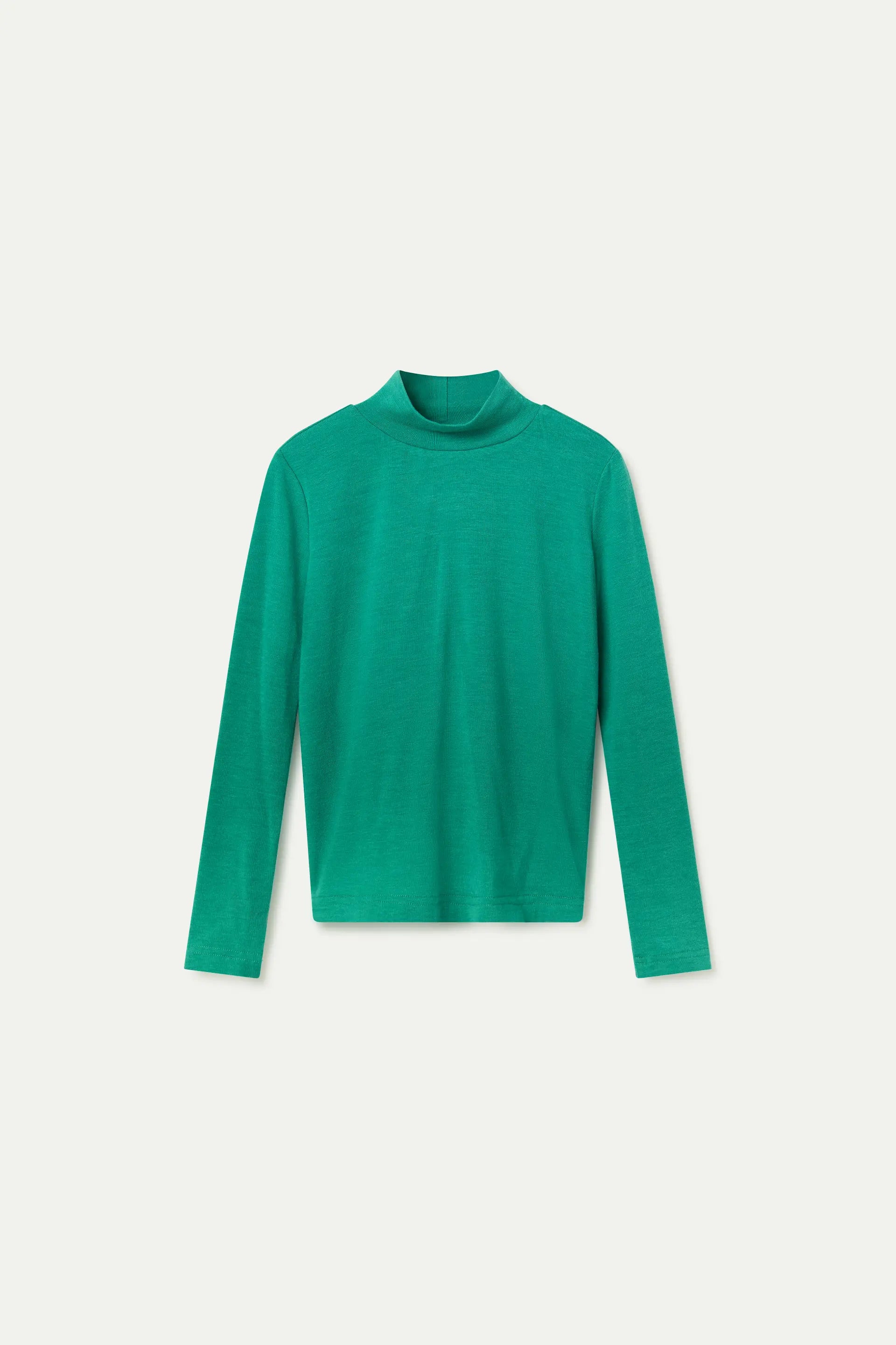Turquoise fine knit girl's sweater with a high neck and long sleeves.