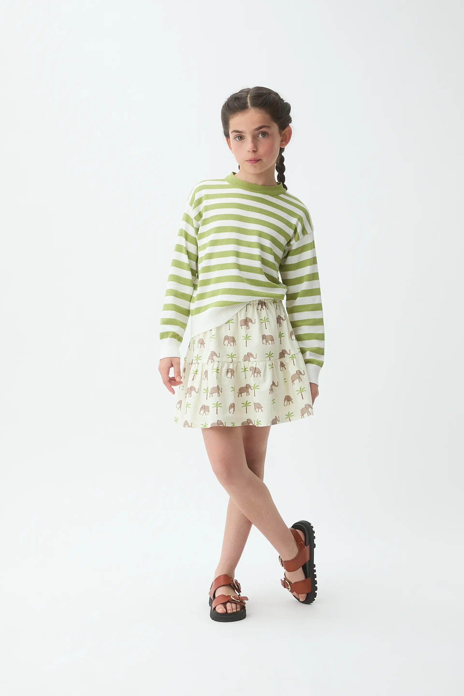 Girls' sweater with a white and green striped print. Round neck and long sleeves. Slightly dropped shoulders. Ribbed trim details. The model is 135 cm tall and wears size 8-9 years.