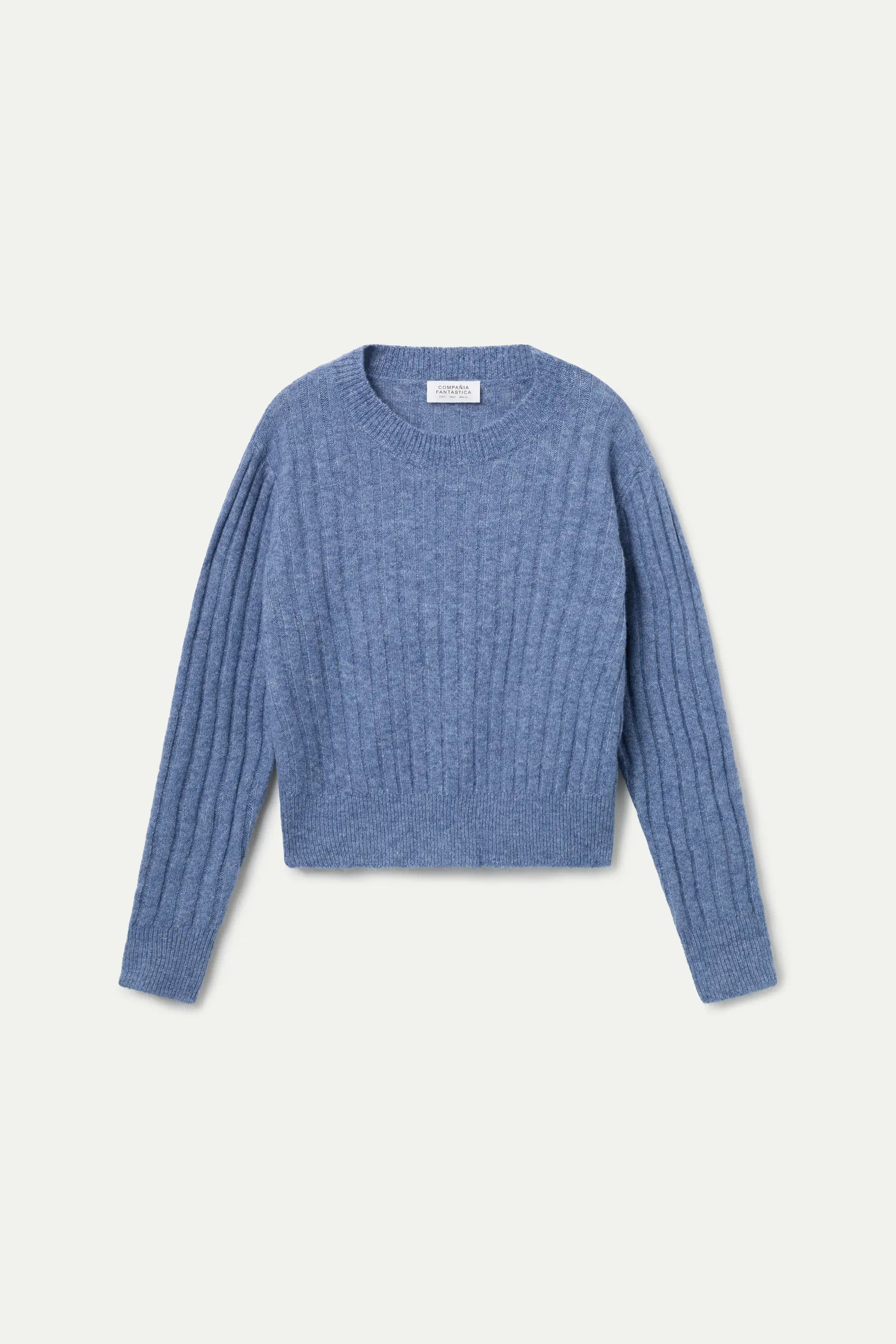Knitted sweater with blue vertical stripes. Featuring a round neckline and long sleeves with slightly dropped shoulders. Ribbed trim. The model is 177 cm tall and is wearing a size S.
