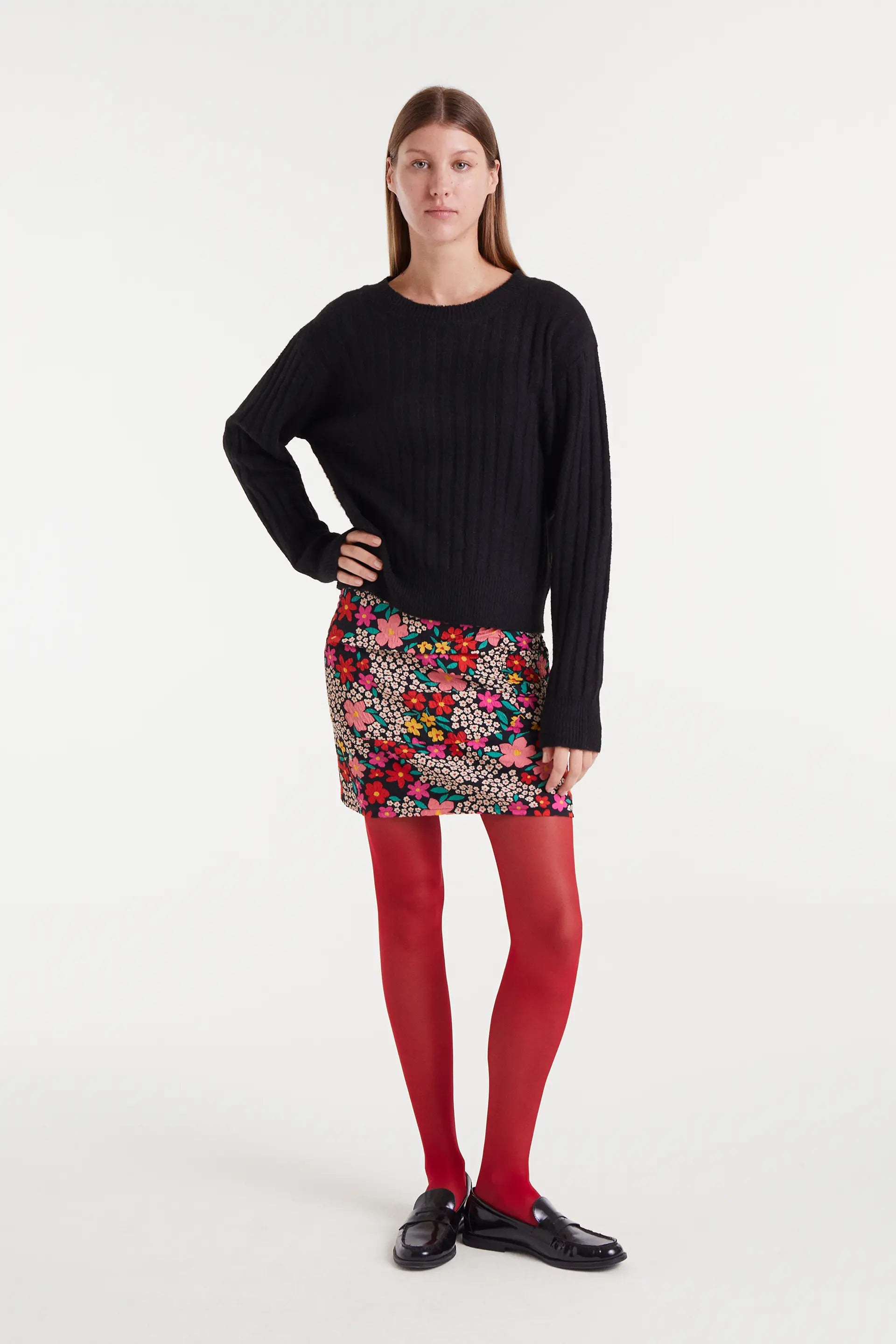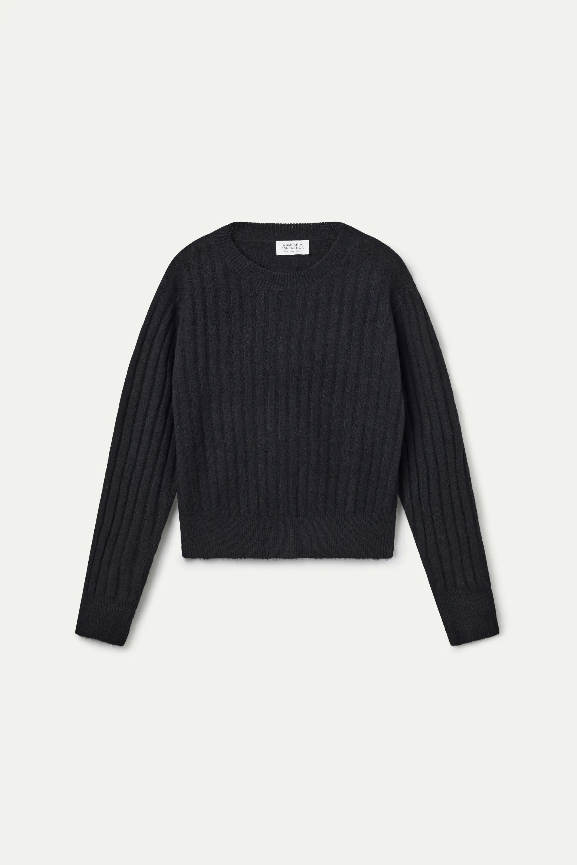 Black vertical striped knit sweater. Featuring a round neckline and long sleeves with slightly dropped shoulders. Ribbed trim. The model is 177 cm tall and is wearing a size S.