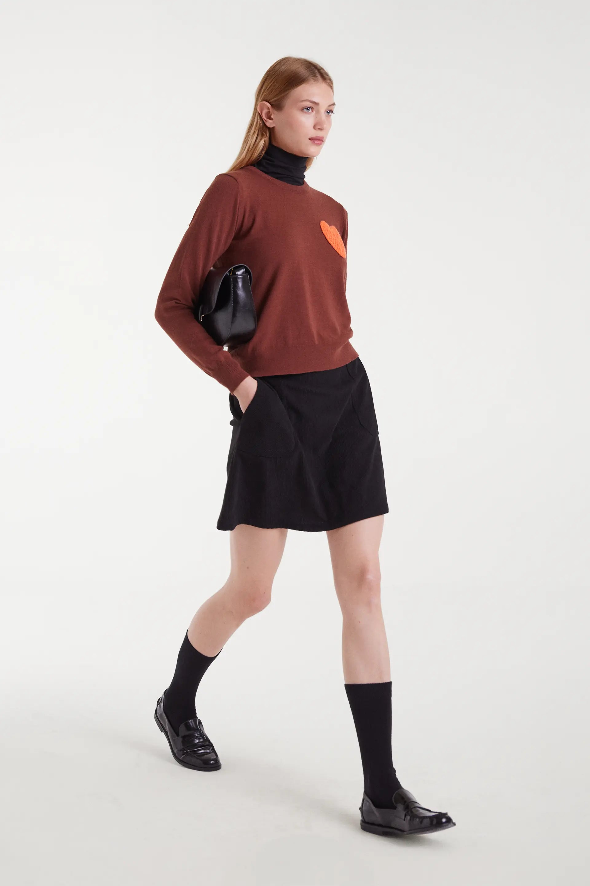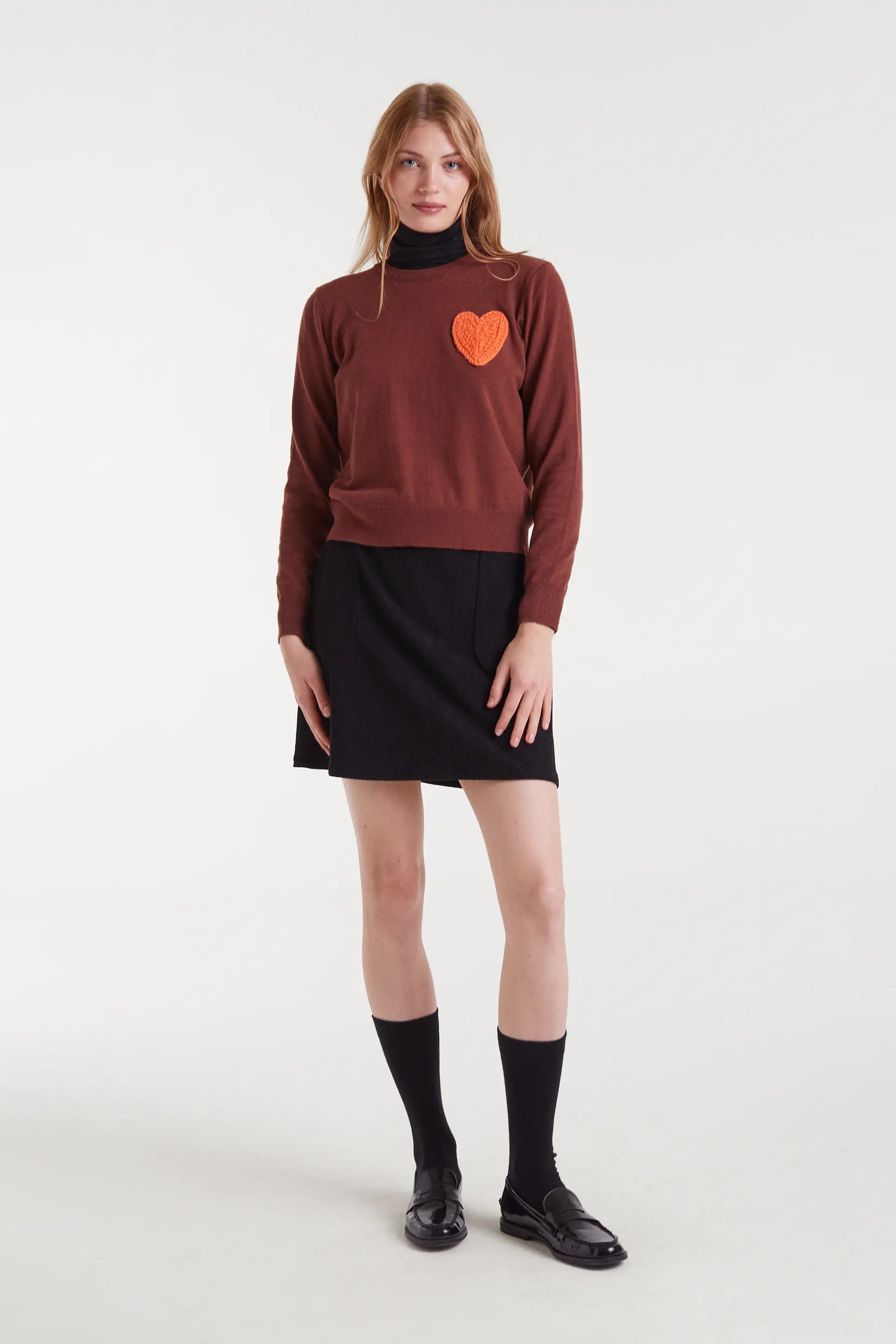 Brown knit sweater with an embroidered orange heart print. Round neck and long sleeves. Ribbed trim. The model is 179 cm tall and is wearing a size S.