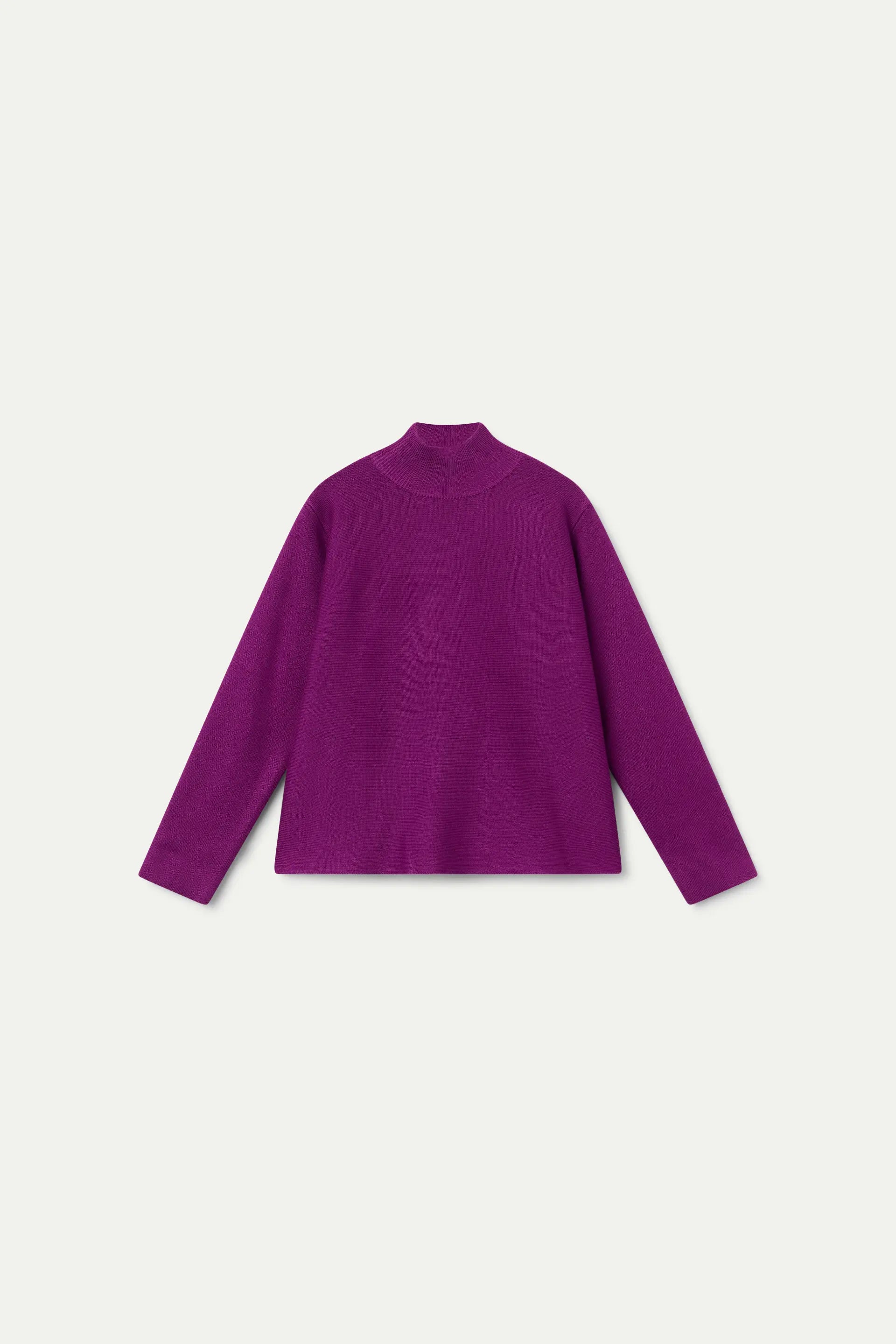 Purple girls' long-sleeved sweater with a high neck made of soft, smooth fabric.