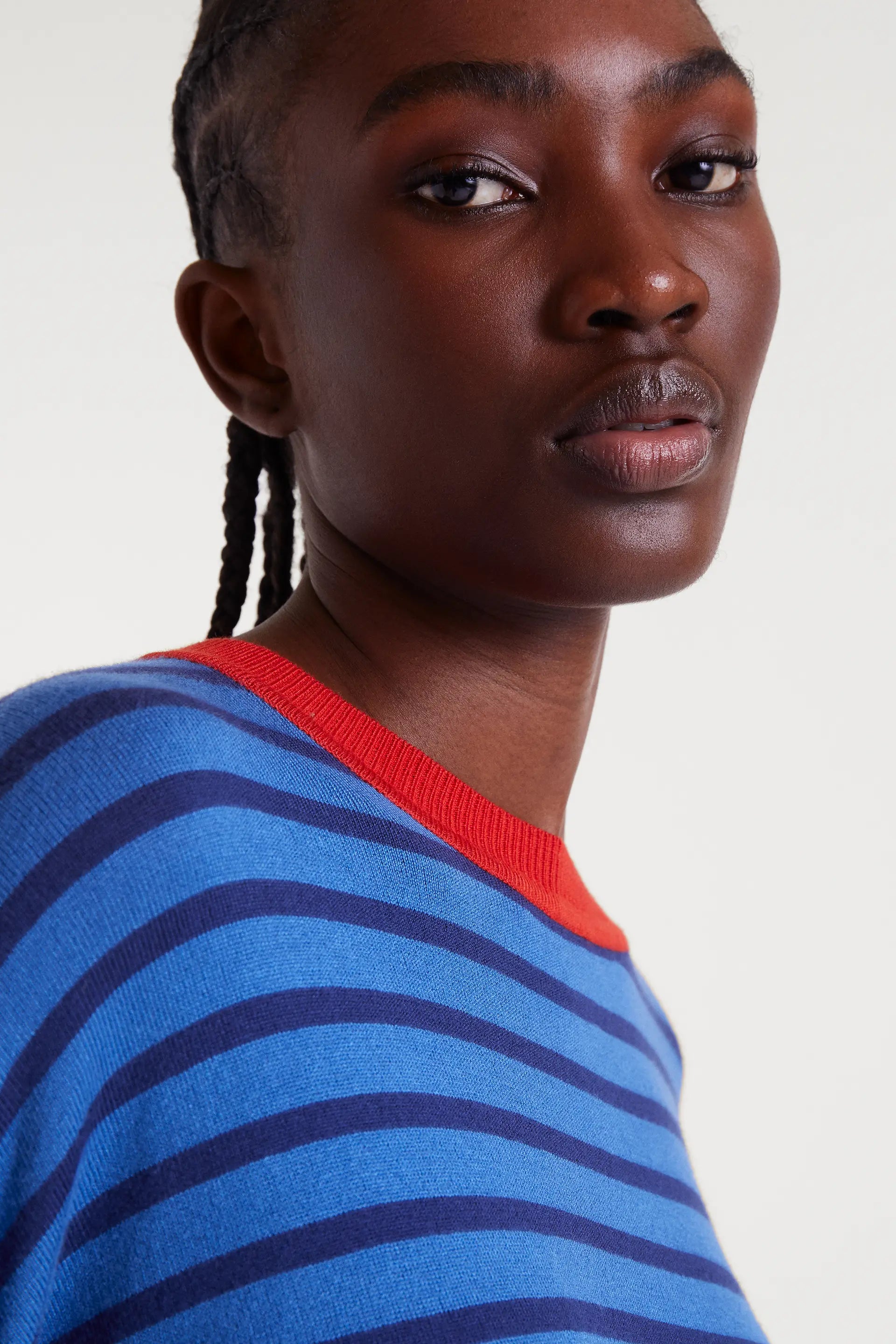 Blue striped knit sweater with a round neck and long sleeves with slightly dropped shoulders. Ribbed trim. The model is 178 cm tall and is wearing a size S.