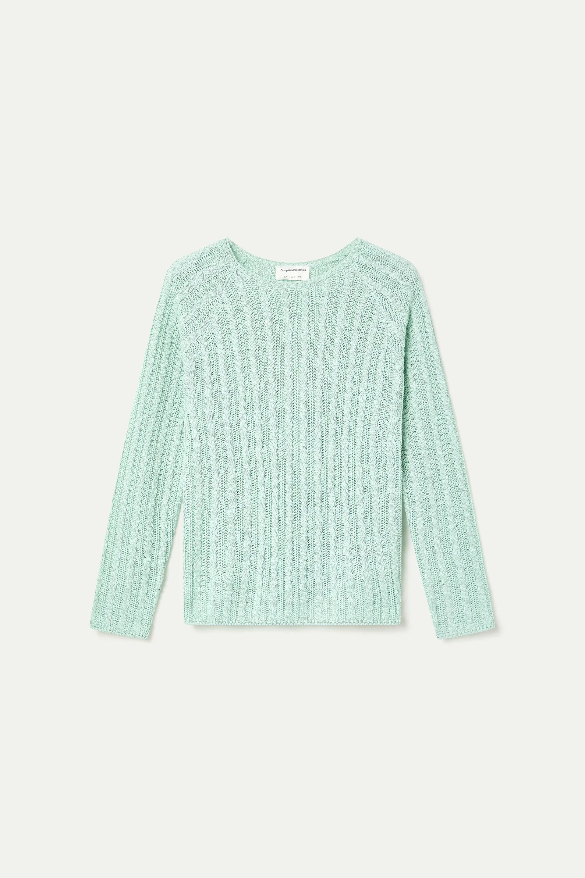 Green knit sweater. Round neck and long sleeves. The model is 175 cm tall and wears size S.