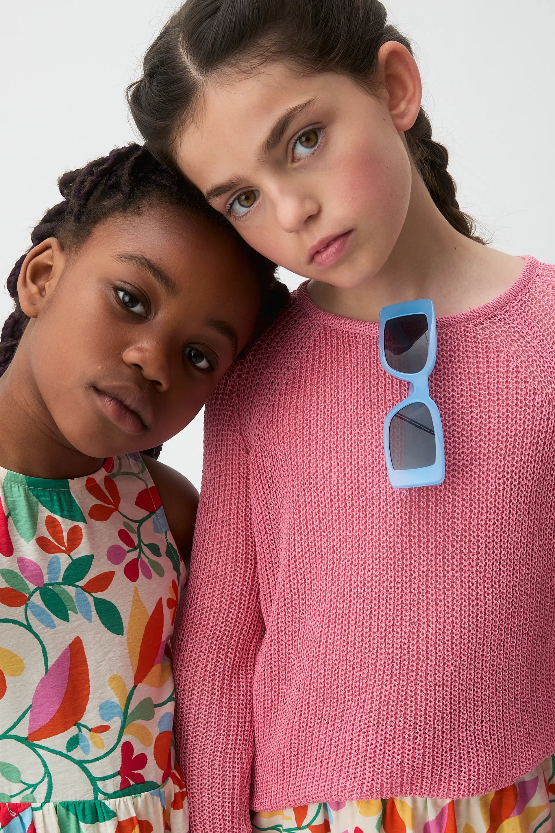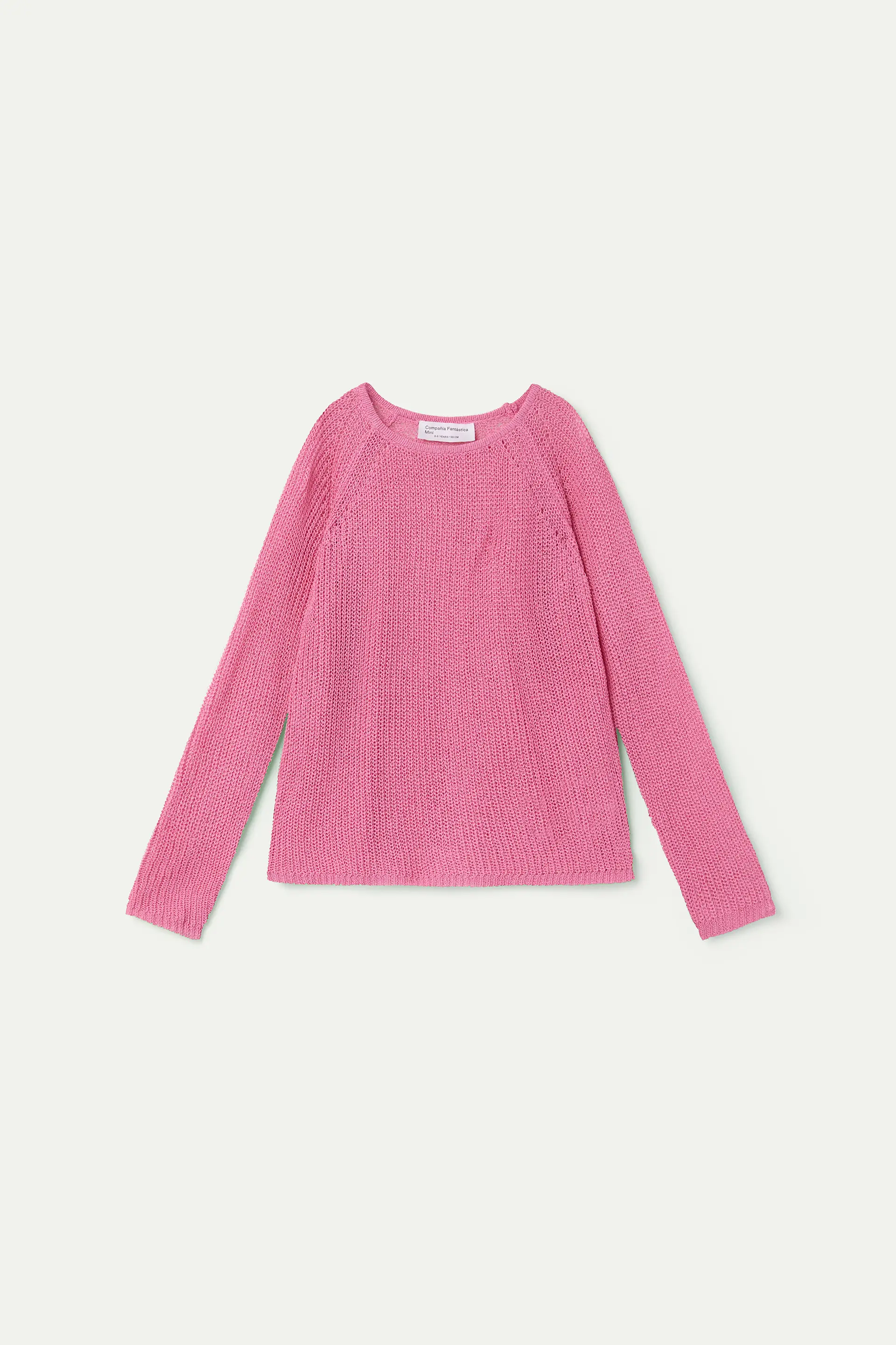 Girls' pink knit sweater. Round neck and long sleeves. Slightly dropped shoulders. The model is 135 cm tall and wears size 8-9 years.