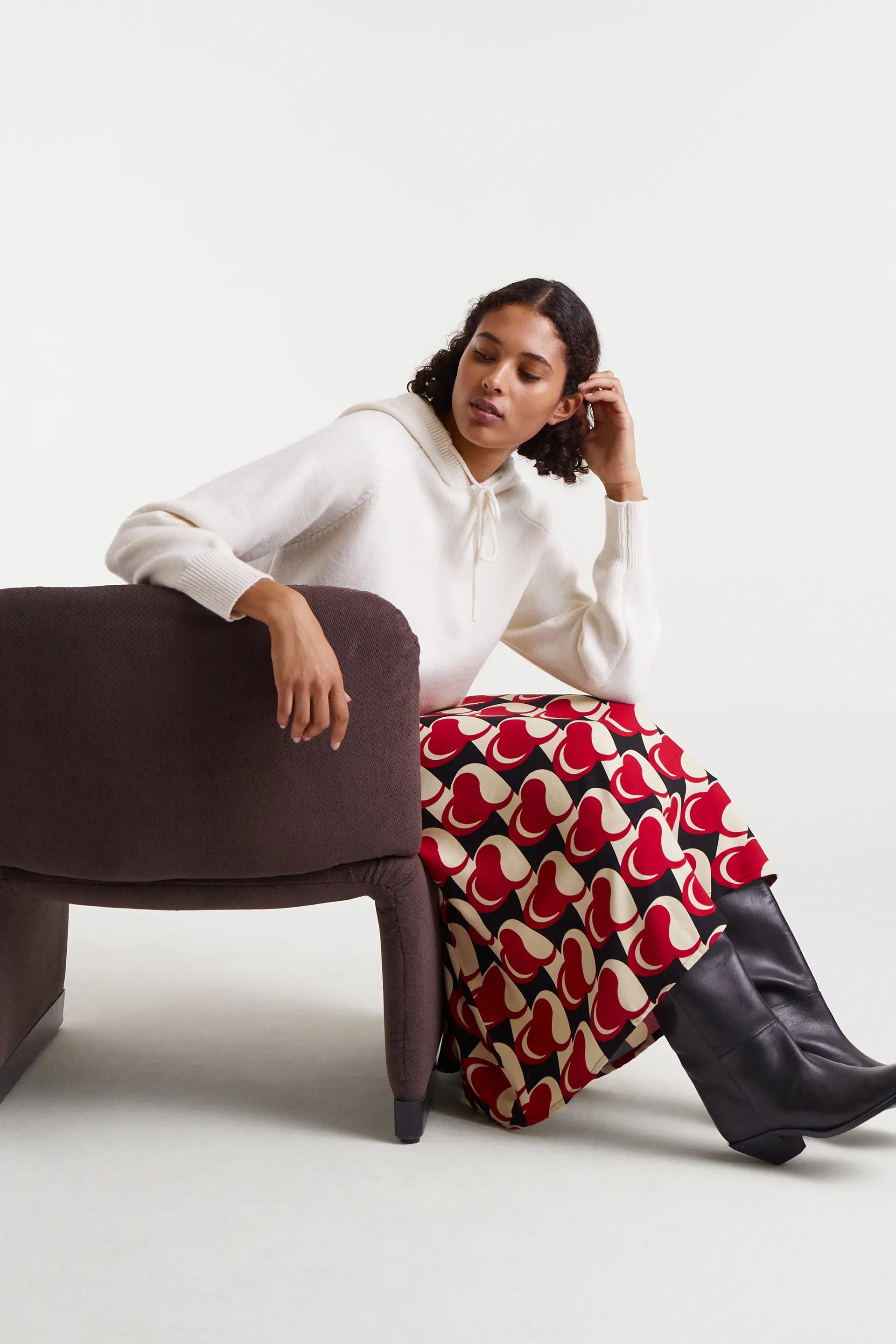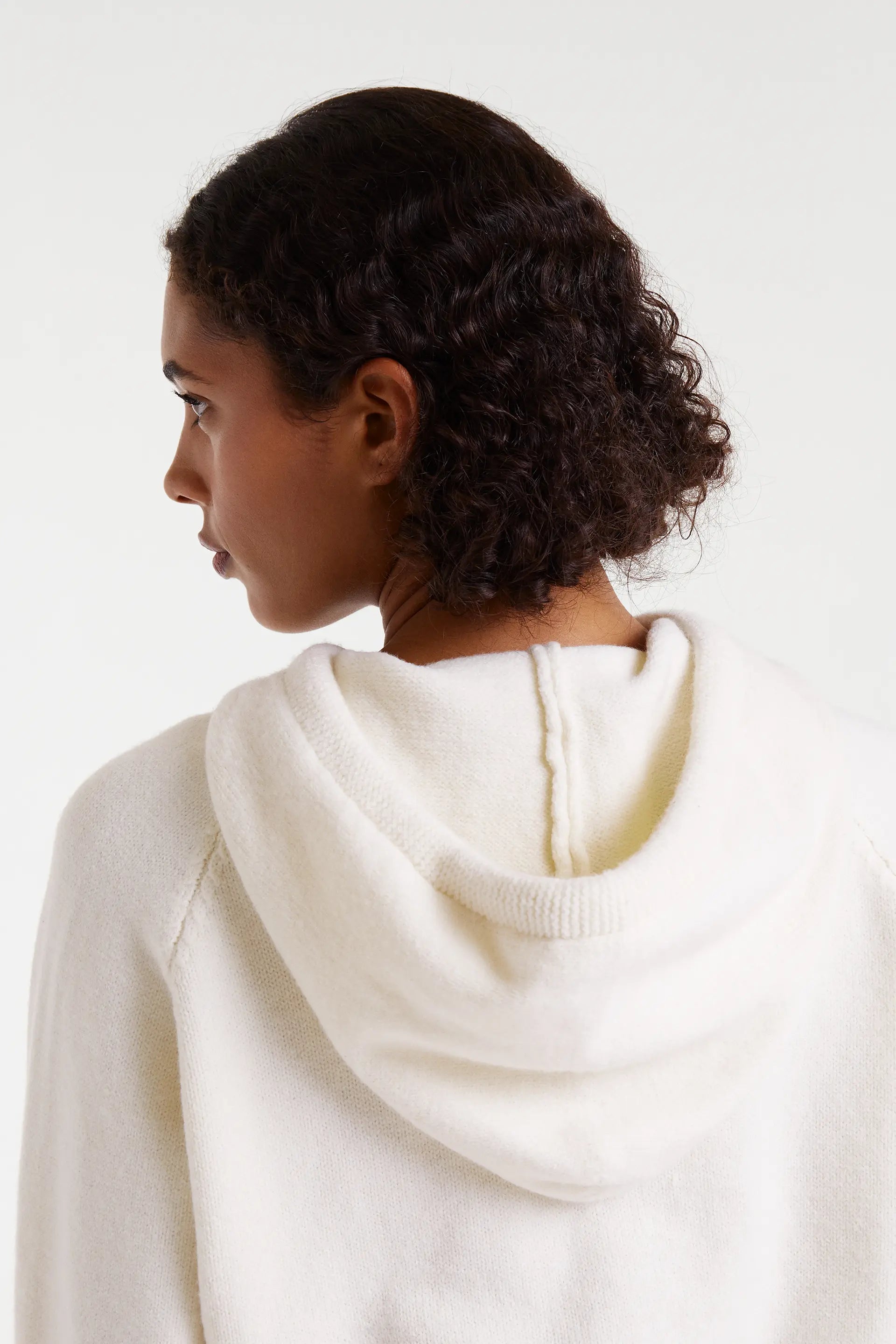 White fine-knit sweater with adjustable drawstring hood and long sleeves. Slightly dropped shoulders. Ribbed details. The model is 175 cm tall and is wearing a size S.