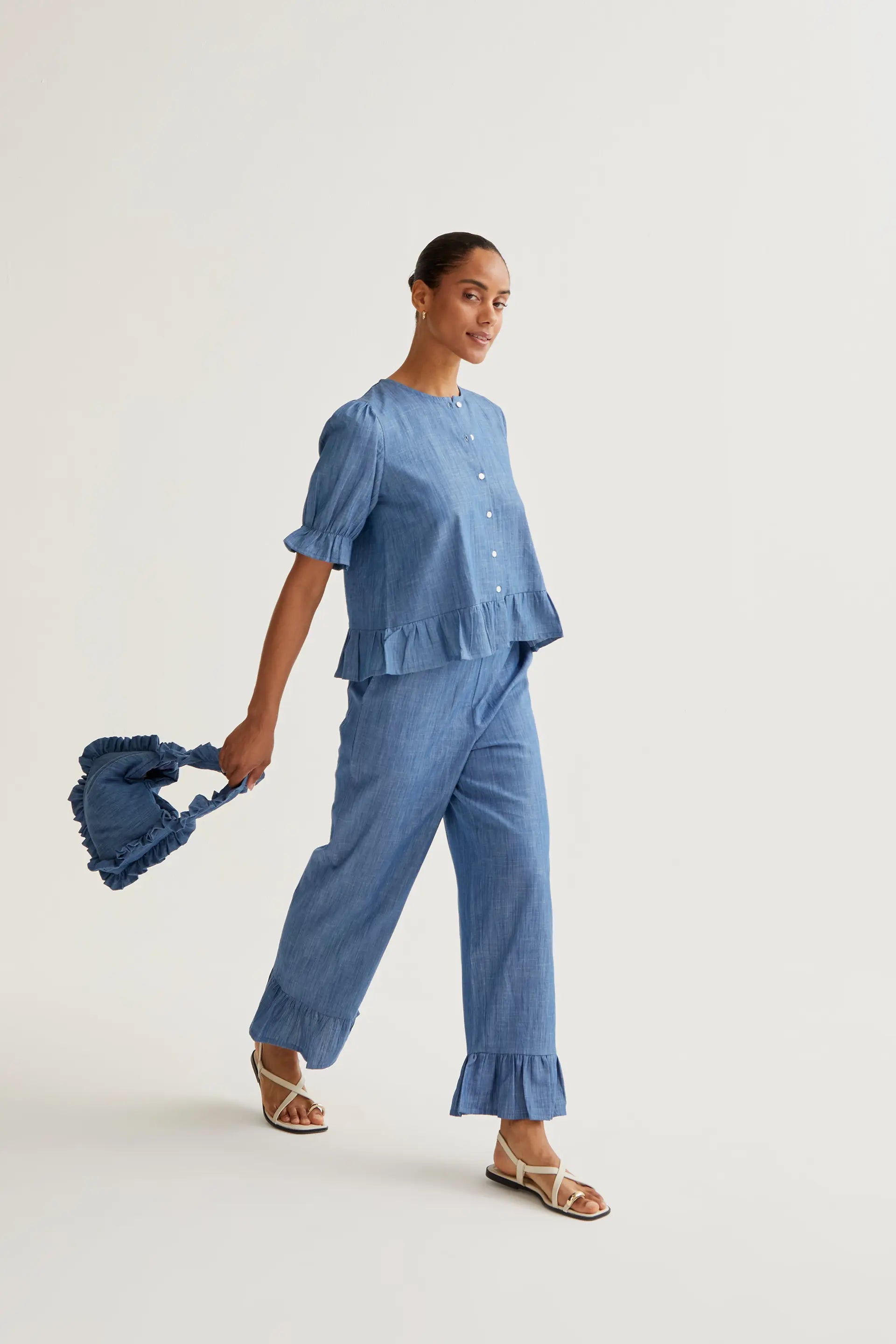 Trousers made from 100% cotton chambray fabric in light blue. High-waisted elasticated fixed waistband. Wide straight leg. Ruffle details. The model is 173 cm tall and wears size S.
